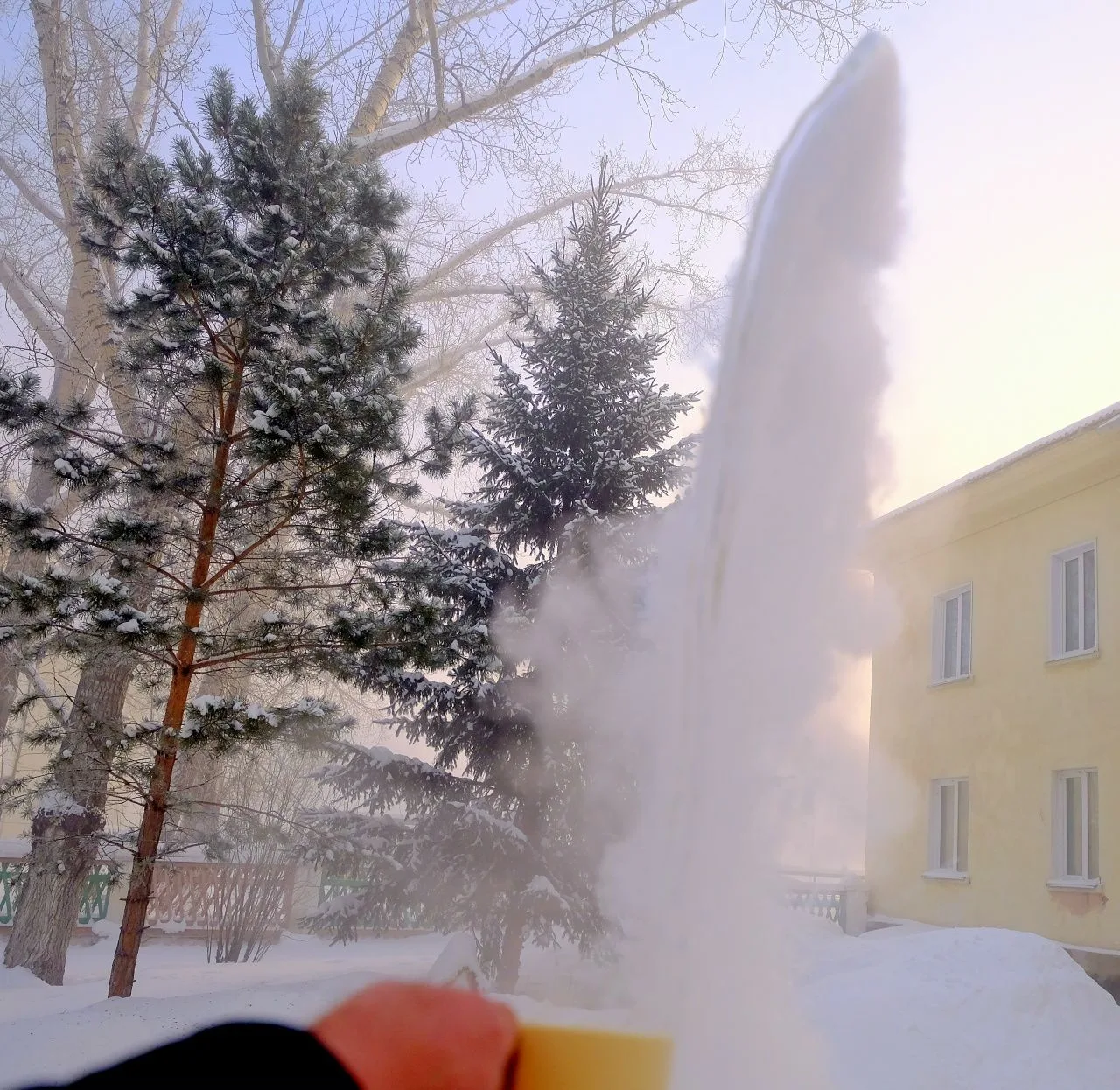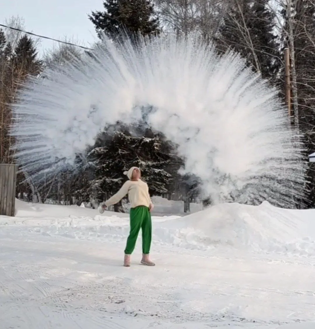 Еще одна наша подписчица, Алёна, показала, что делает с кипятком настоящий сибирский мороз. При температуре около −40 градусов горячая вода не падает вниз, а в воздухе мгновенно рассыпается паром и инеем - резко испаряется еще в полете.