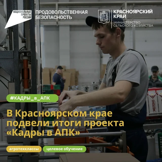 В текущем году в рамках проекта «Кадры в АПК для практики на агропромышленных предприятиях планируется привлечь 275 студентов, обучить по ученическим договорам и договорам о целевом обучении не менее 37 человек, поддержать не менее 25 специалистов Красноярского аграрного университета, задействованных в научных отраслевых проектах. Также как минимум еще в одной школе края будут созданы два агротехнологических класса.