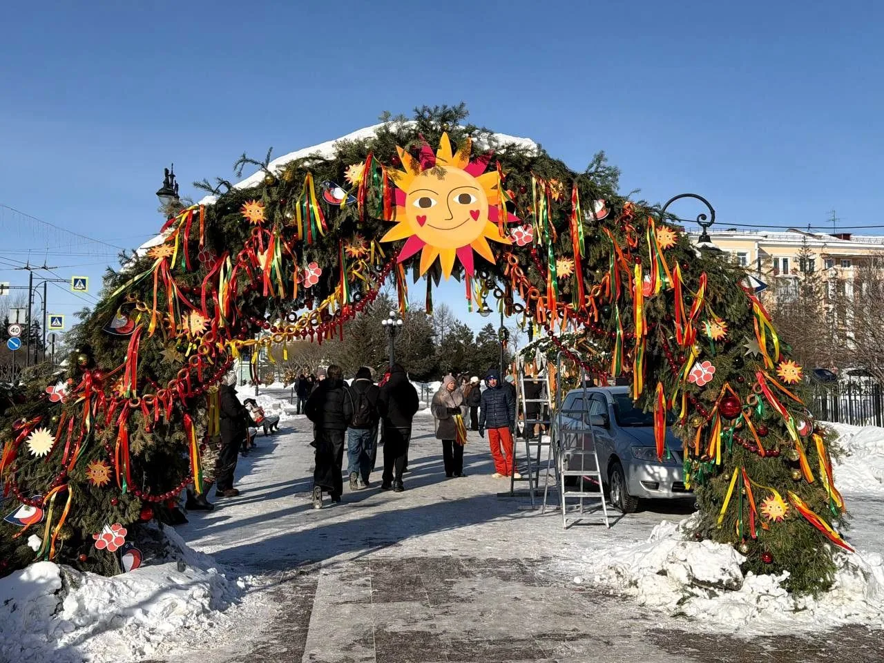 На Любинском проспекте начали устанавливать праздничные локации к Масленице, которая в 2026 году пройдет под девизом «Омск — город по имени Солнце». Главным украшением стала яркая арка, декорированная хвойными ветками, разноцветными лентами и улыбающимся солнцем — символом приходящей весны.