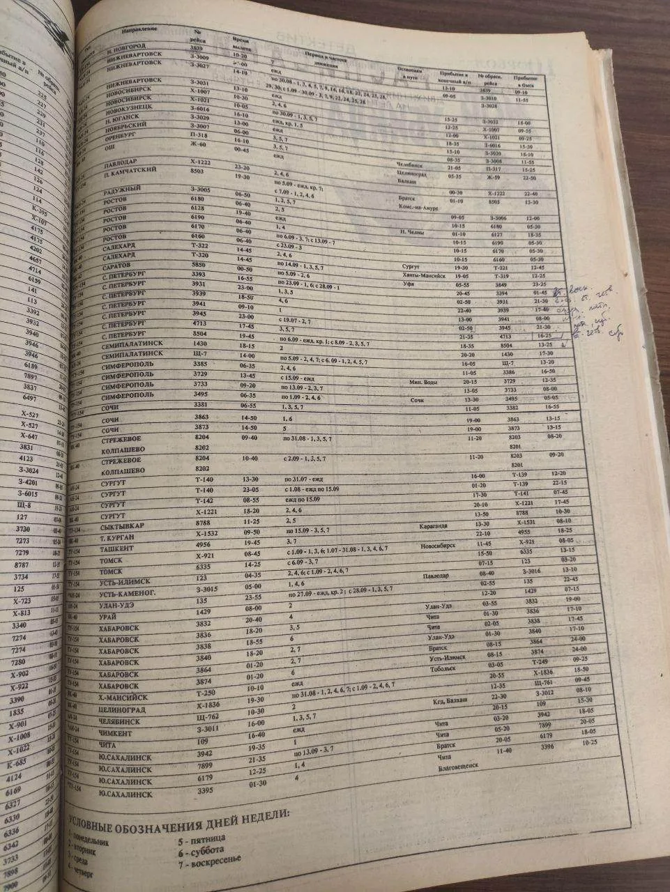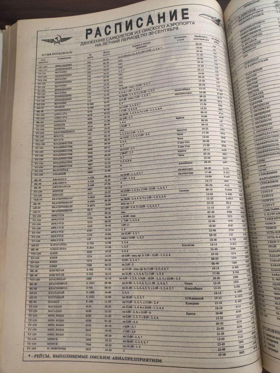 Коллеги из газеты «Ваш Ореол» нашли уникальный артефакт — расписание омского аэропорта 34-летней давности. Цифры поражают: в начале 90-х из нашего города можно было улететь почти в любую точку России и СНГ. Мы насчитали 62 прямых направления! Для сравнения: сегодня регулярная сеть охватывает всего 18 городов.