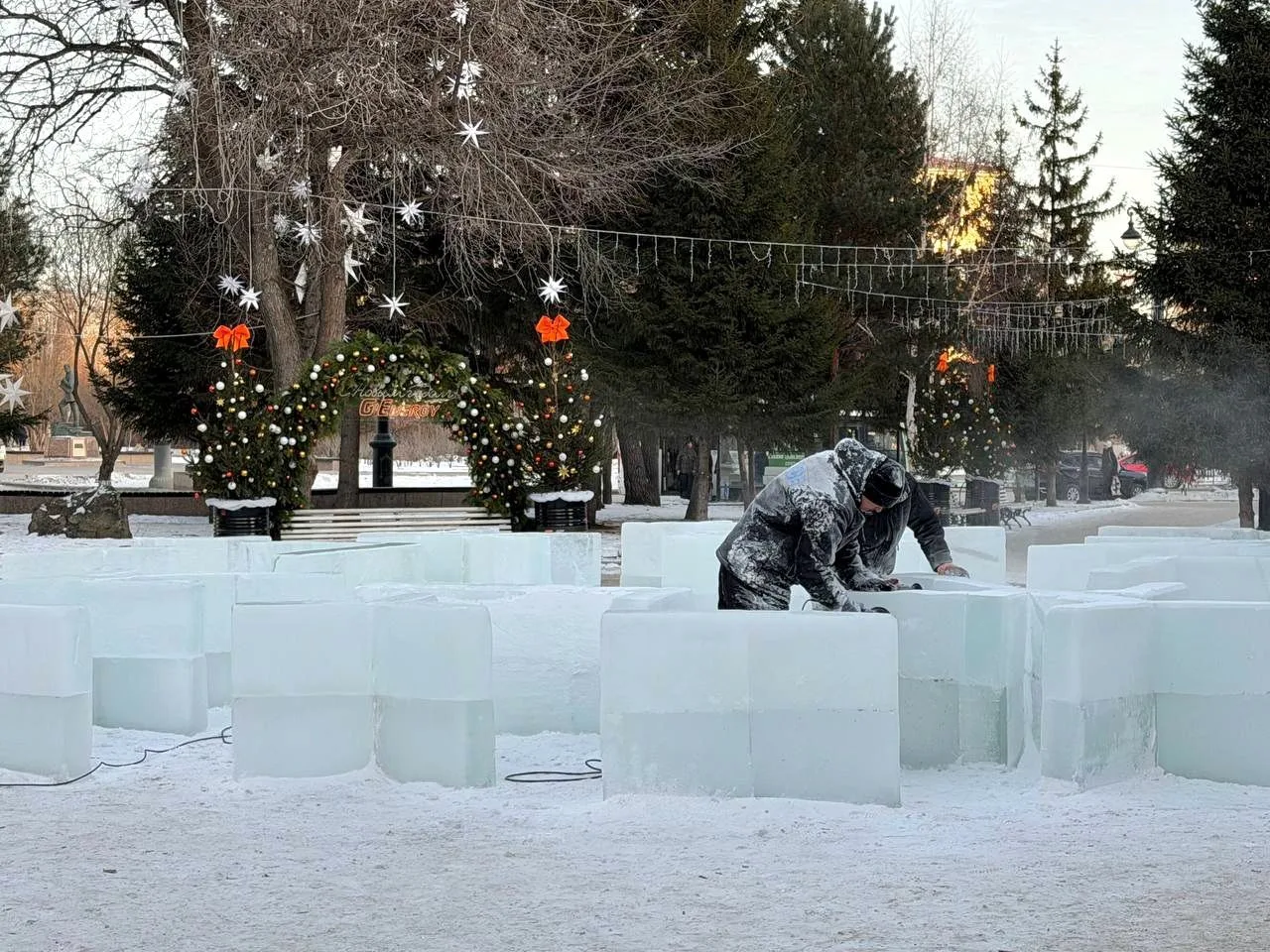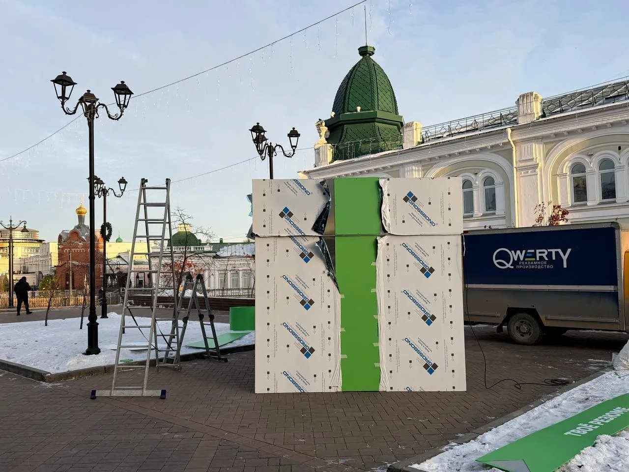 У перекрёстка с Ленина уже ставят гигантский «подарок» от Сбера, деревья увешаны красно-золотыми шарами, а мастера берутся за ледяные фигуры, горки и огромный лабиринт напротив «Эрмитажа-Сибирь» и в Театральном сквере.