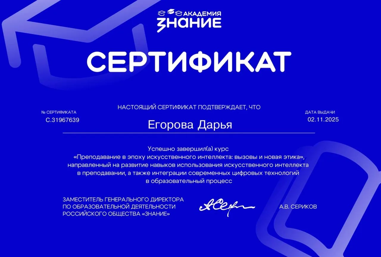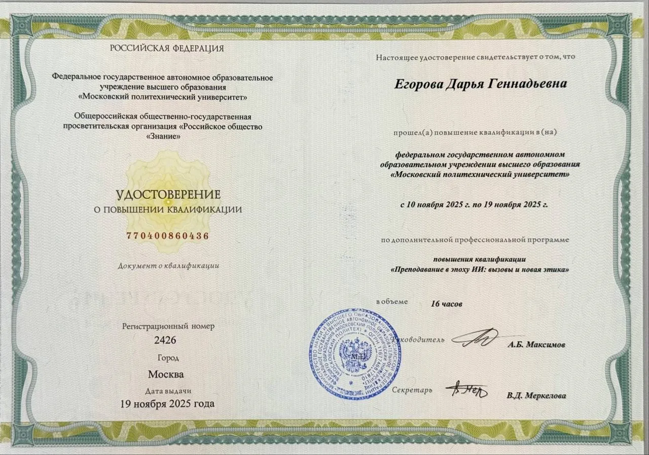 В 2025 я окончила курс новой академической честности (обожаю это название), училась как использовать генеративный ИИ в практике преподавания и успешно интегрировать его в процесс обучения.