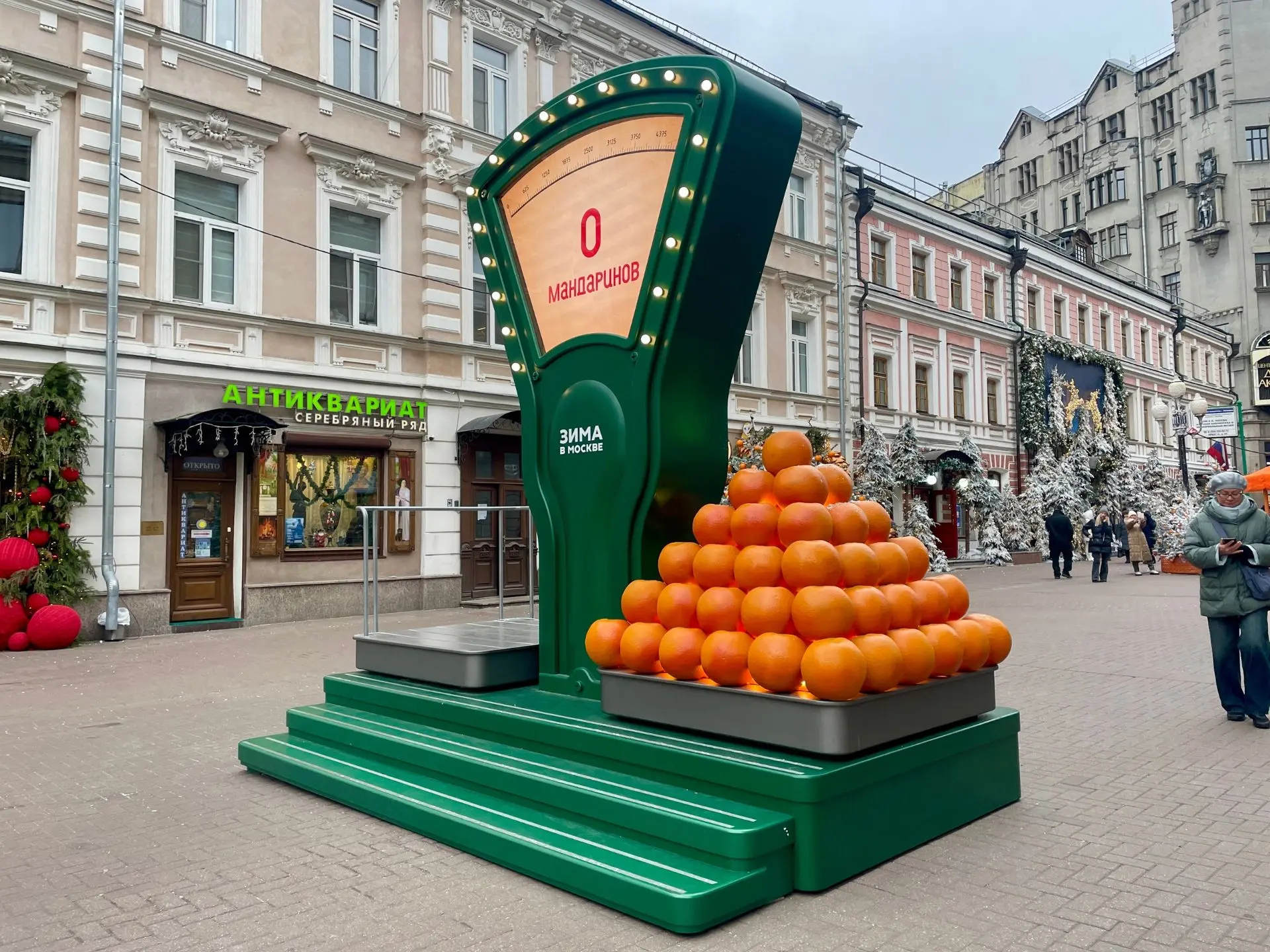 На Арбате появились необычные весы. Жители уже активно их тестируют, ведь они показывают ваш вес не в килограммах, а в мандаринах.