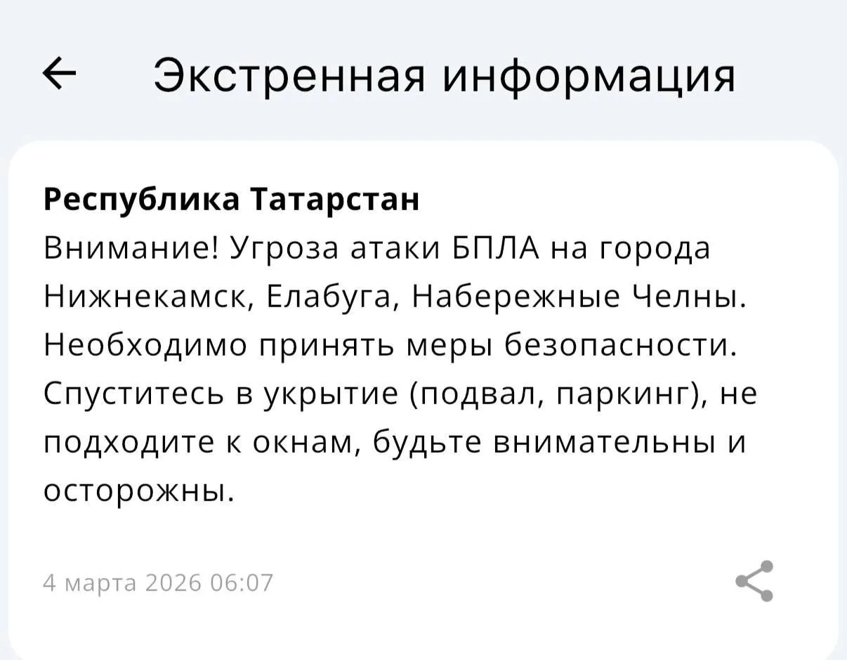 ❗️Для трех городов Татарстана объявлена угроза атаки БПЛА.