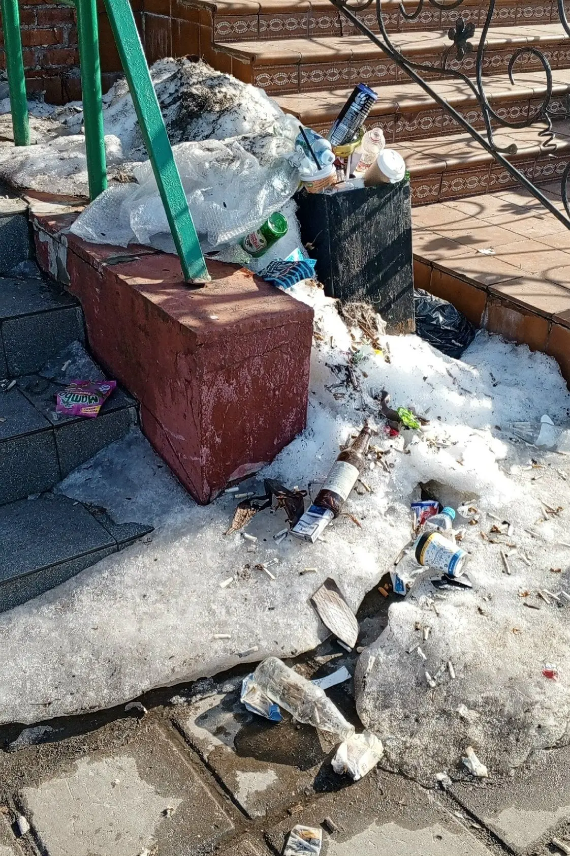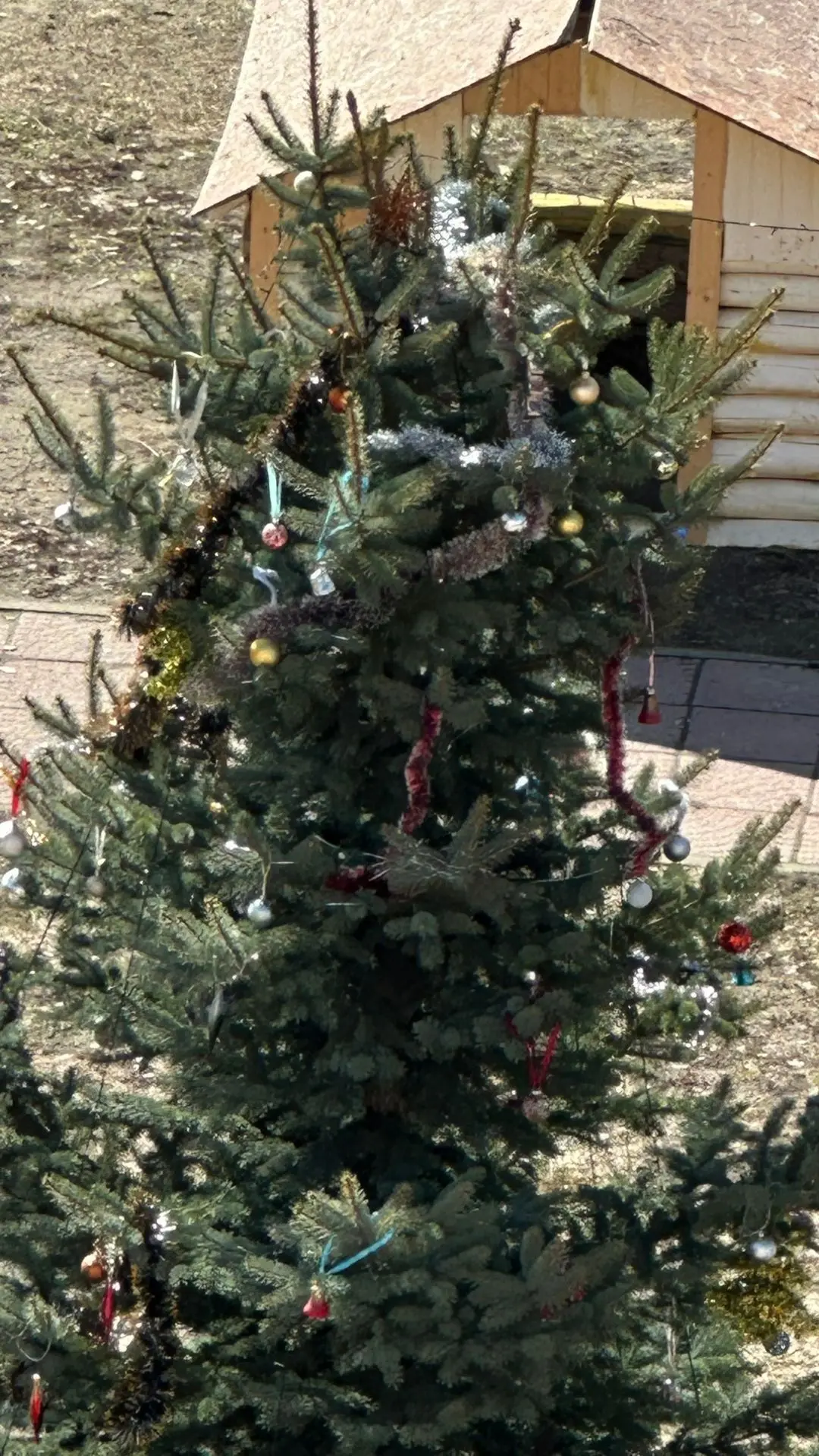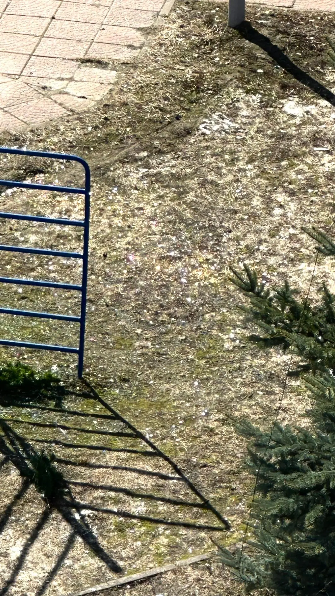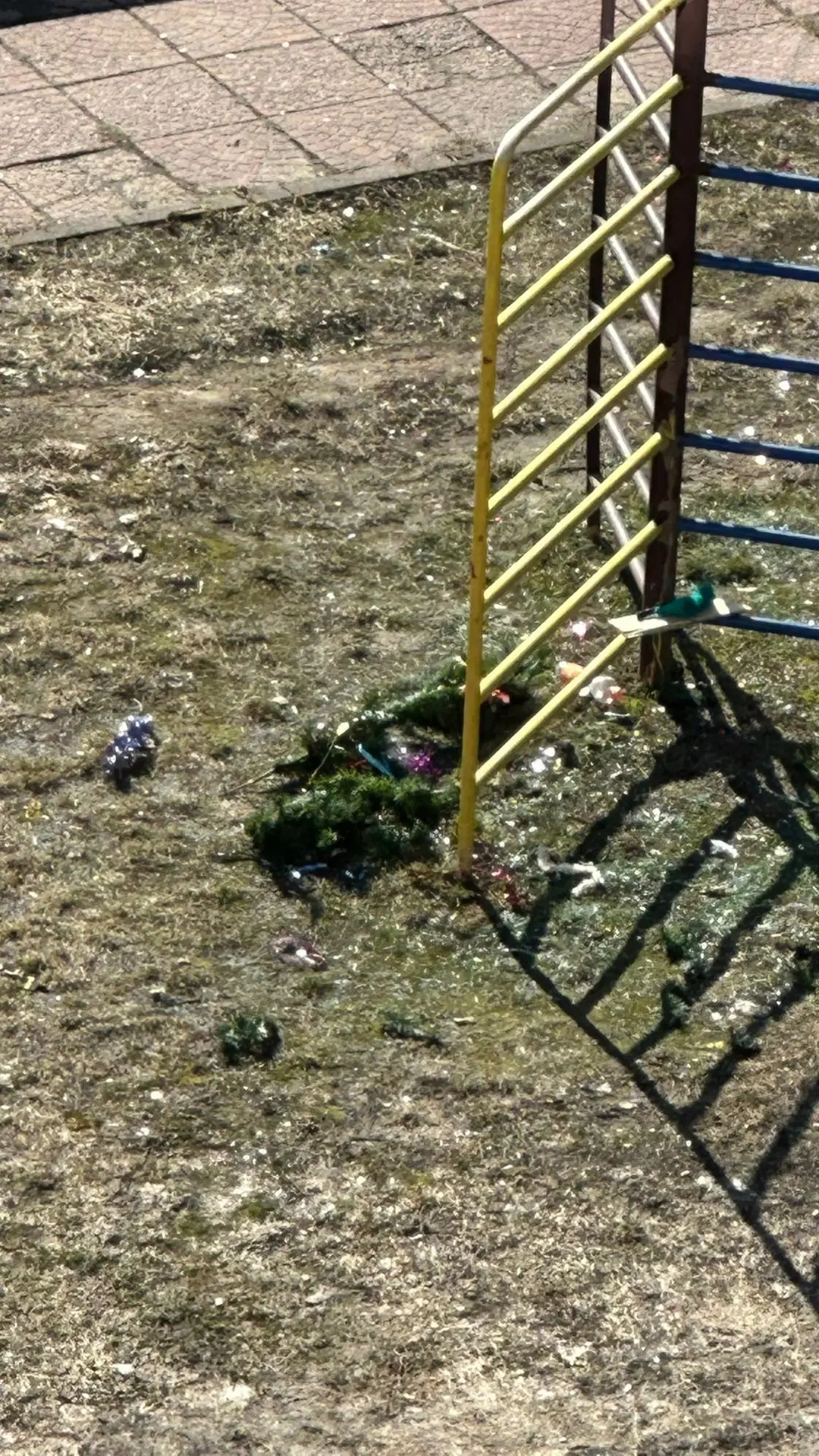 Наряженные елки до сих пор! Дети стеклянные игрушки сбивают палкой и давят ногами. Все в стекле и пешеходные дорожки, и весь газон на площадке детской!