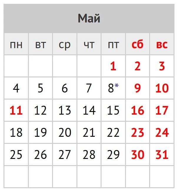 Помимо суббот и воскресений, отдыхать россияне будут с 1 по 3 мая — в честь Праздника Весны и Труда, и с 9 по 11 мая — в честь Дня Победы.