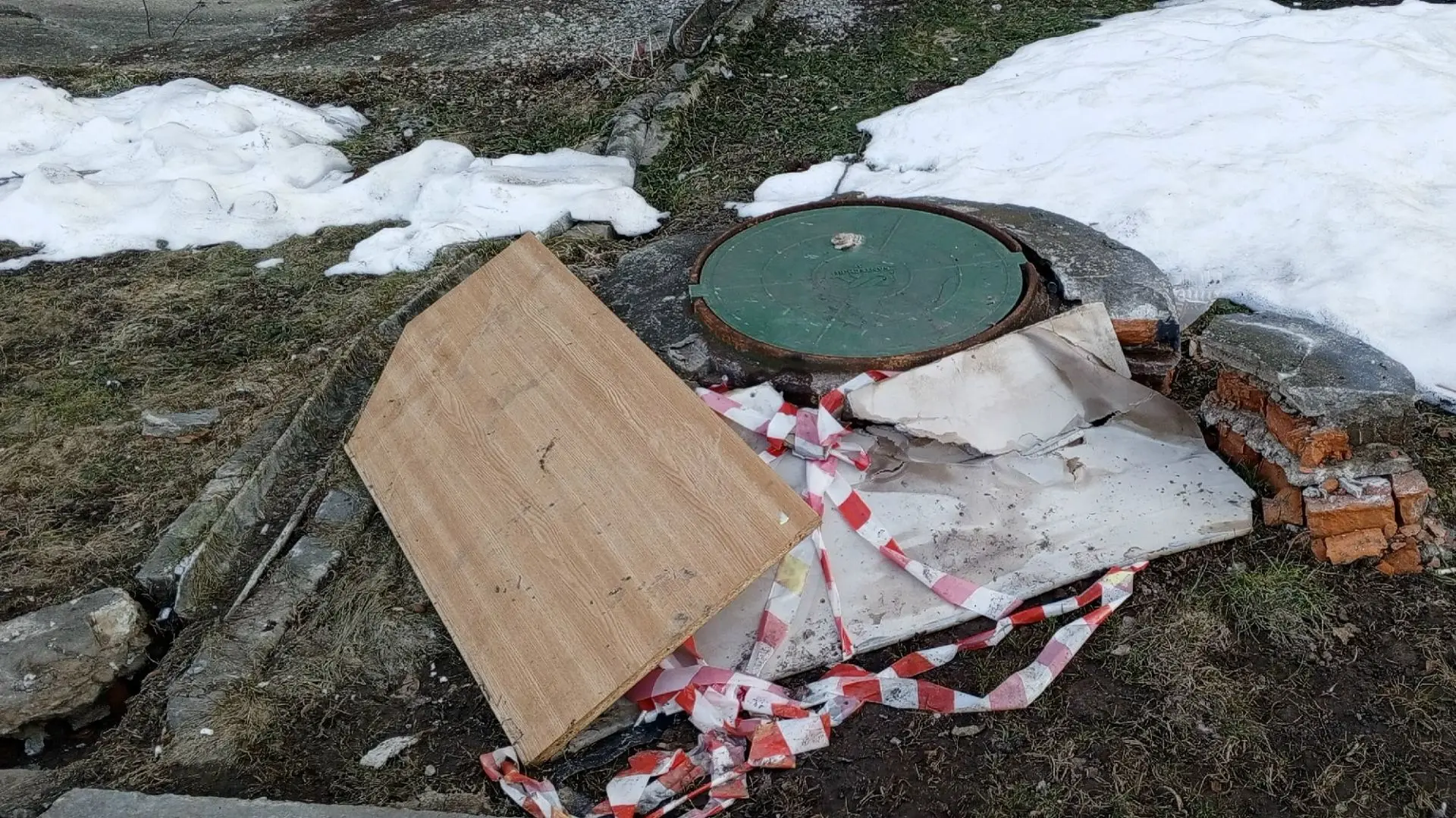 Переулок Пионерский 5: под сугробом не было видно дыр в колодце, снег растаял, прикрыли "другим сугробом".