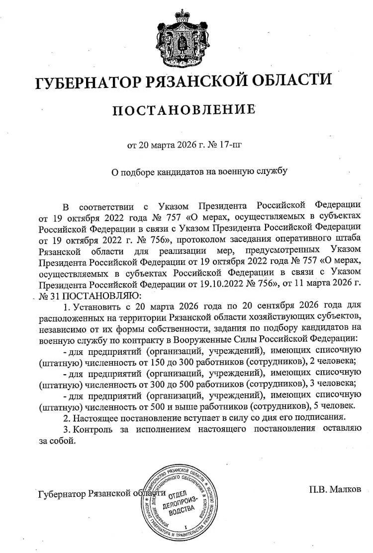 Постановление, подписанное губернатором Малковым, обязывает все хозяйствующие субъекты отбирать кандидатов на военную службу.