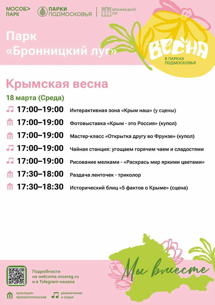 Завтра в парке «Бронницкий луг» состоится мероприятие Крымская весна 🇷🇺 🌸, посвященное Дню присоединения Крыма к России.