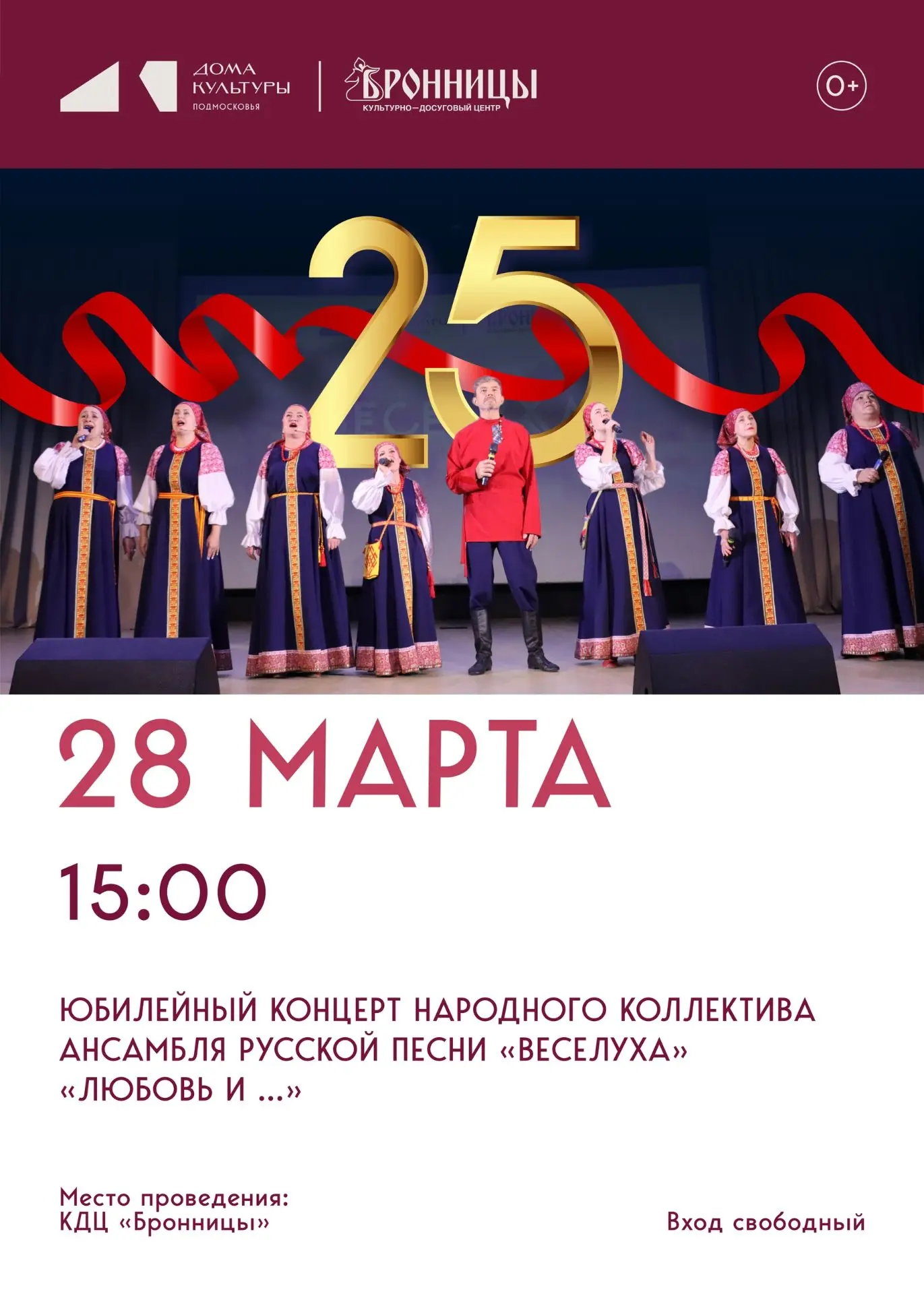 КУЛЬТУРНО-ДОСУГОВЫЙ ЦЕНТР "БРОННИЦЫ" ПРИГЛАШАЕТ ВАС НА РАДОСТНОЕ СОБЫТИЕ - ЮБИЛЕЙНЫЙ КОНЦЕРТ АНСАМБЛЯ РУССКОЙ ПЕСНИ "ВЕСЕЛУХА" "ЛЮБОВЬ И..."