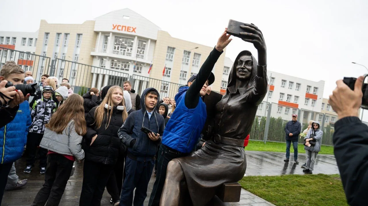 В Дзержинском у школы "Успех" открыли скульптуру блогера учителя. Памятник представляет из себя девушку с букварем в руке, делающую селфи на фоне учебного заведения и сидящей на цифре