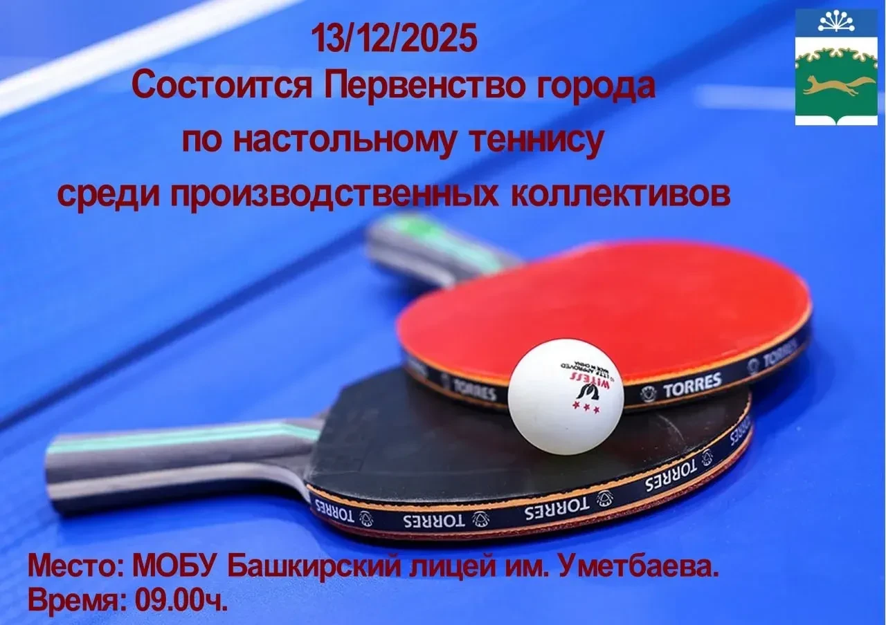 13 декабря в 9:00 в Башкирском лицее им. Р. Уметбаева состоится первенство города по настольному теннису среди производственных коллективов.