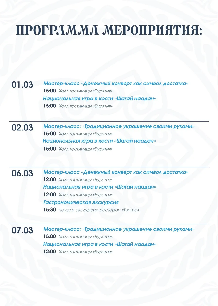 Жители и гости города научатся писать свои имена старомонгольскими буквами, играть в традиционную бурятскую игру «Шагай наадан» и узнают много интересного о культуре Бурятии.