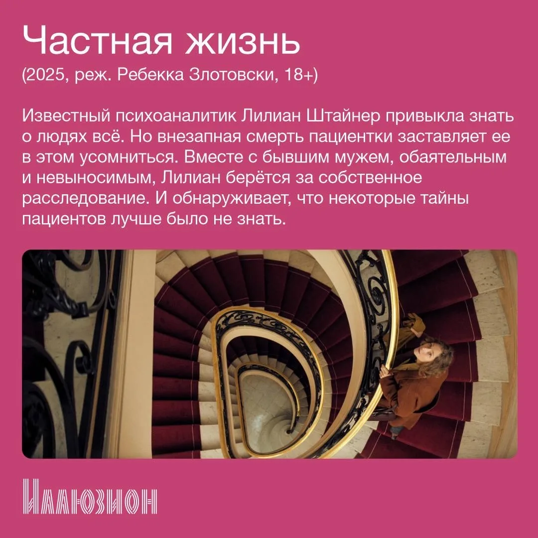 🟣21:00 — Новинки проката: «Частная жизнь» // Известный психоаналитик Лилиан Штайнер (Джоди Фостер) привыкла знать о людях все. Но внезапная смерть пациентки заставляет ее в этом усомниться… // Билеты