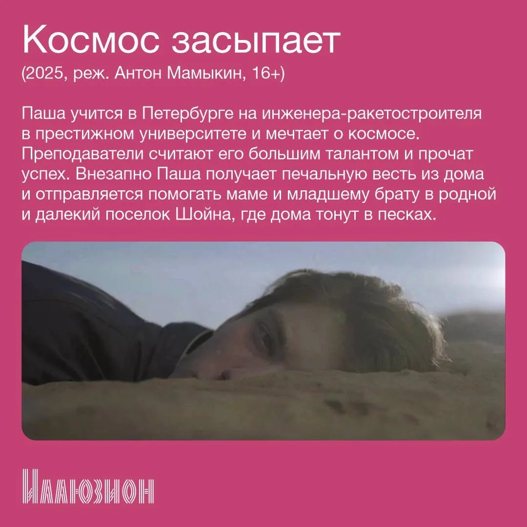 🔵16:45 — Новинки проката: «Космос засыпает» // Паша, учащийся в престижном университете на инженера-раектостроителя получает печальную весть из дома и отправляется помогать маме и младшему брату в родной и далекий поселок Шойна, где дома тонут в песках // Билеты