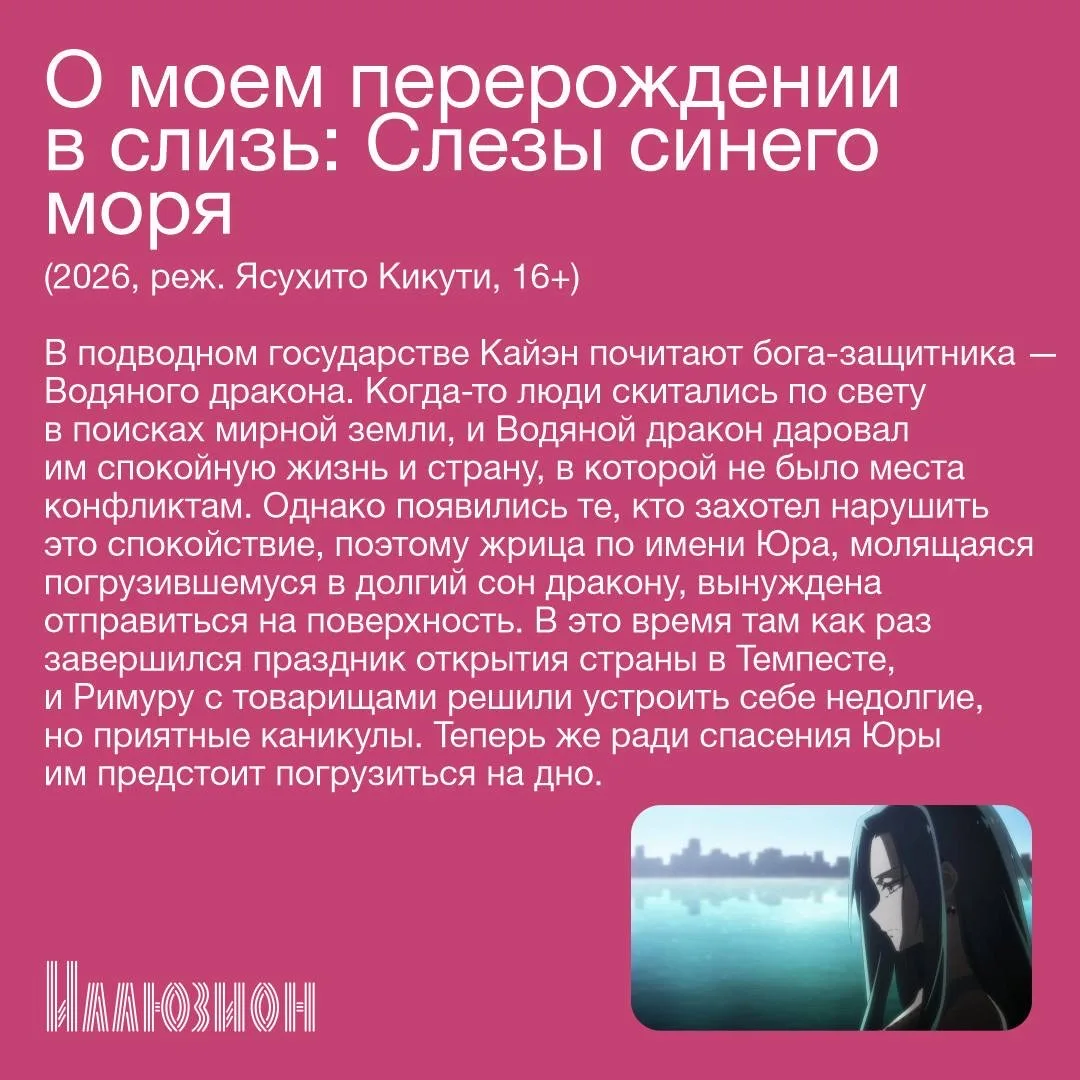 🔵12:00 — Новинки проката: «О моем перерождении в слизь: Слезы Синего моря» // Жрица по имени Юра, молящаяся погрузившемуся в долгий сон дракону, вынуждена отправиться на поверхность из подводного государства Кайэн // Билеты