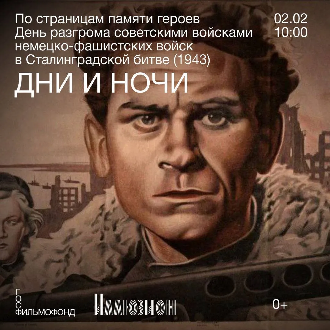 2 февраля в 10:00 в «Иллюзионе» состоится специальный показ военной драмы Александра Столпера «Дни и ночи», приуроченный ко Дню разгрома советскими войсками немецко-фашистских войск в Сталинградской битве.