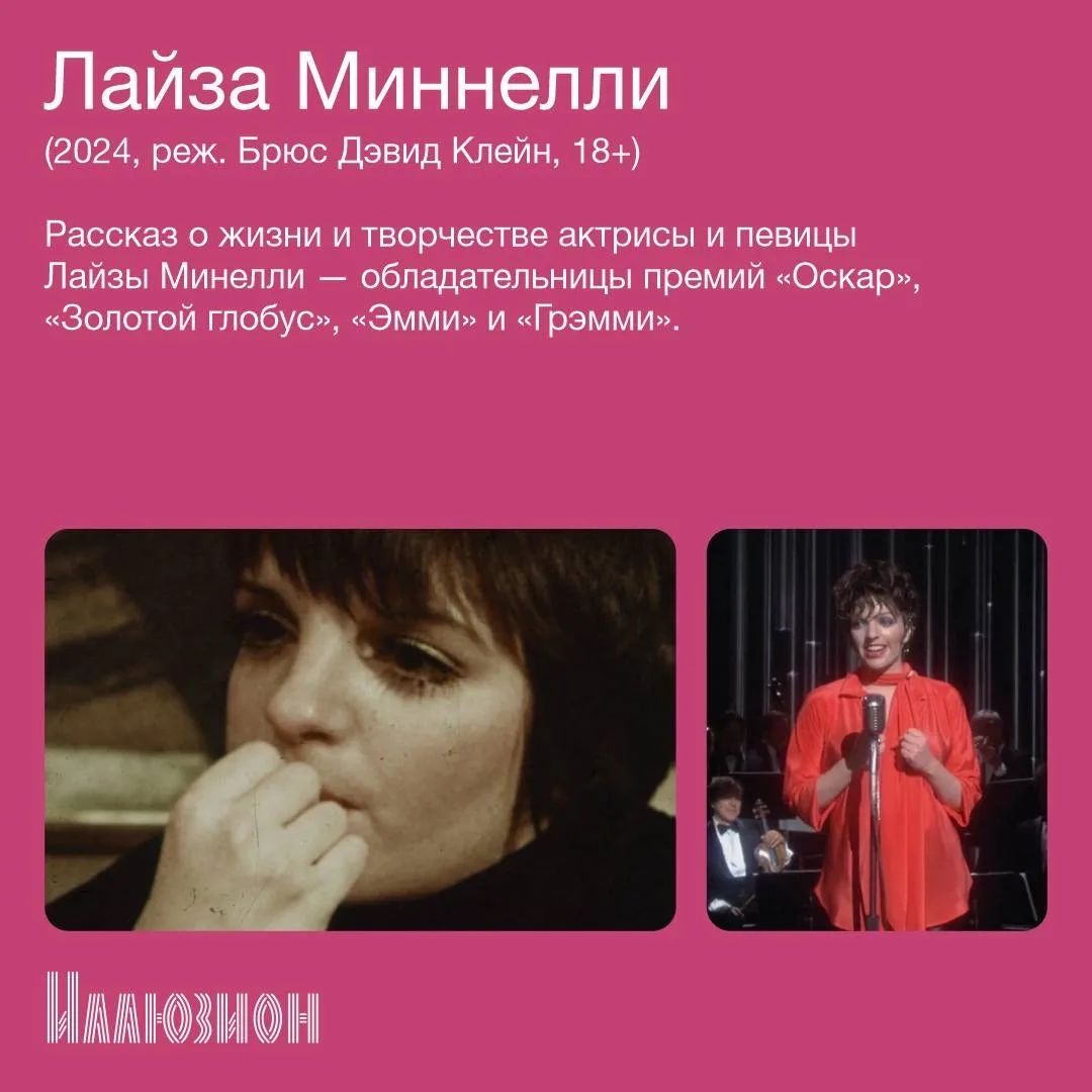 🟣18:55 — Новинки проката: «Лайза Миннелли: Невероятная, но правдивая история» // Юная Лайза Миннелли строит карьеру в шоу-бизнесе и ищет наставников, которые превратят ее природный талант в истинное мастерство // Билеты