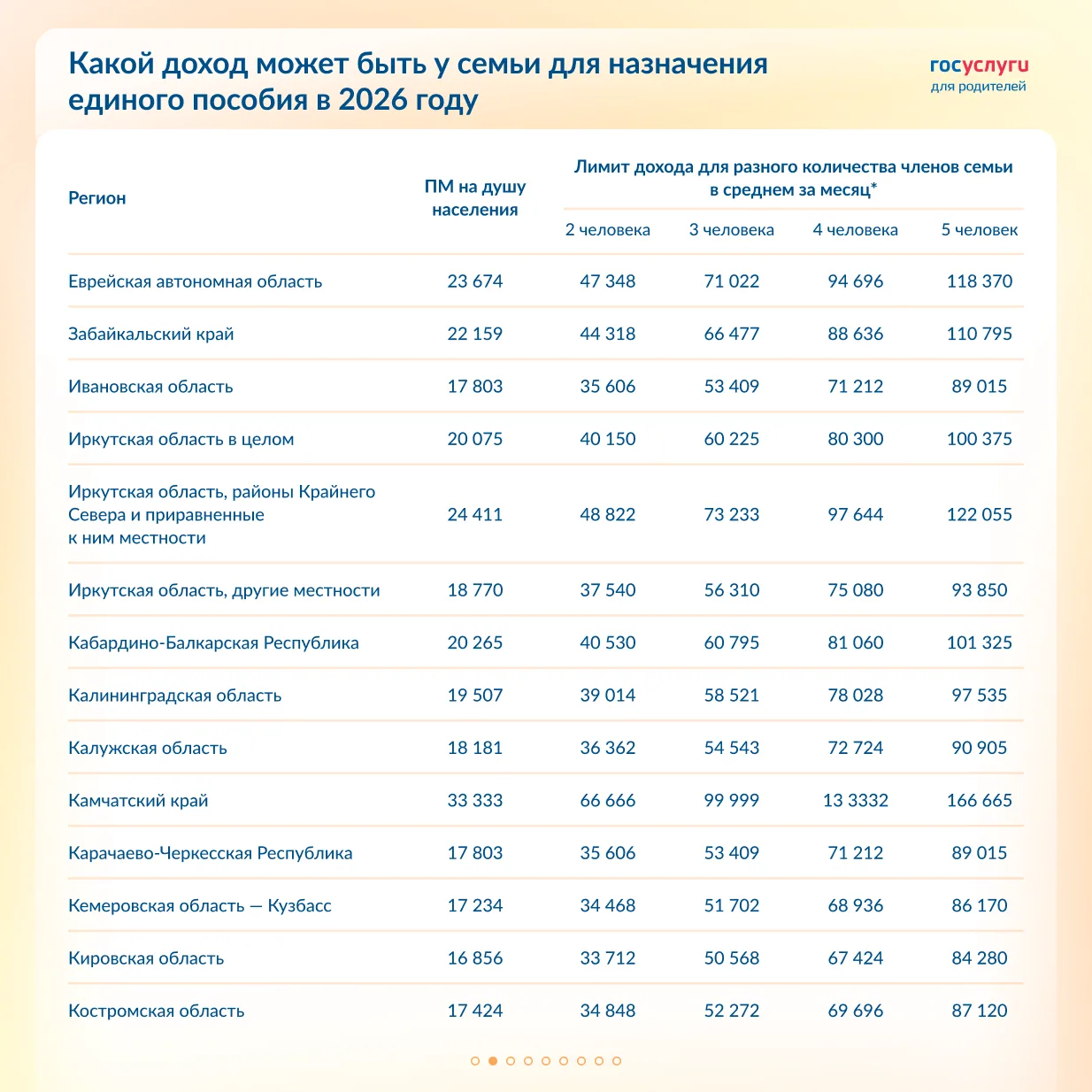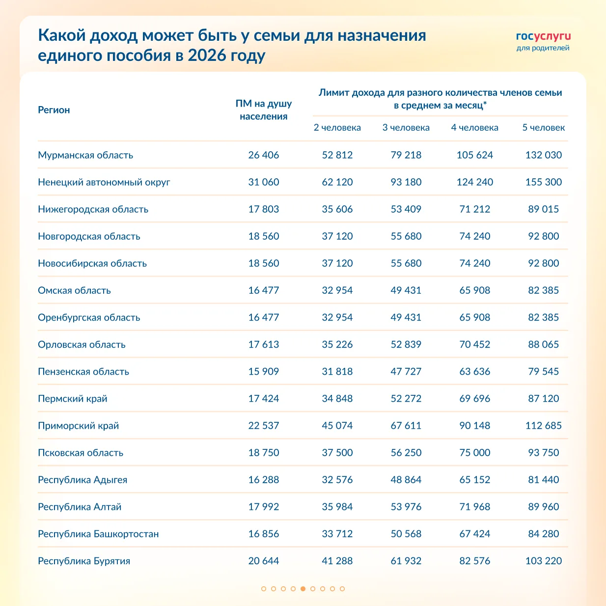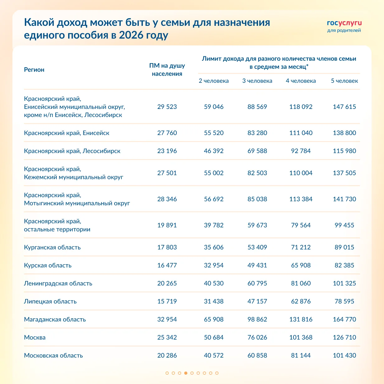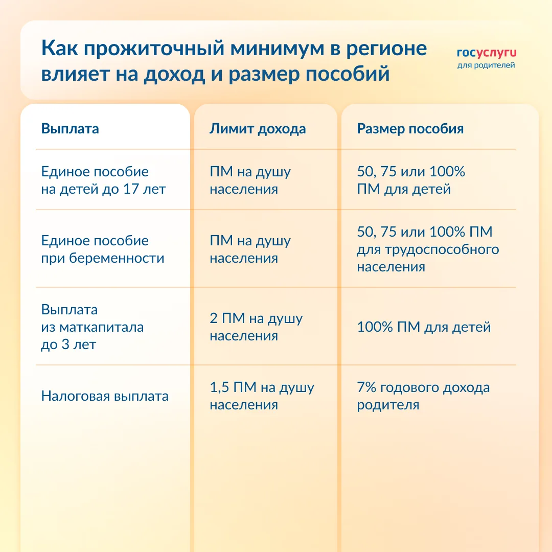 🔹 Для назначения единого пособия среднедушевой доход не должен превышать прожиточного минимума на душу населения в регионе. Проверьте, какой лимит для вашей семьи с учетом ее состава.