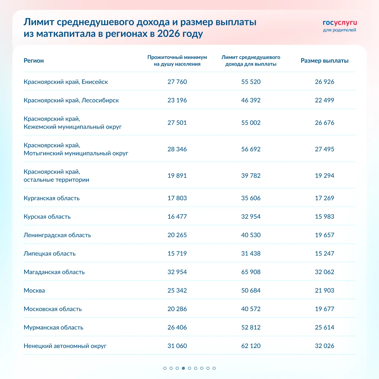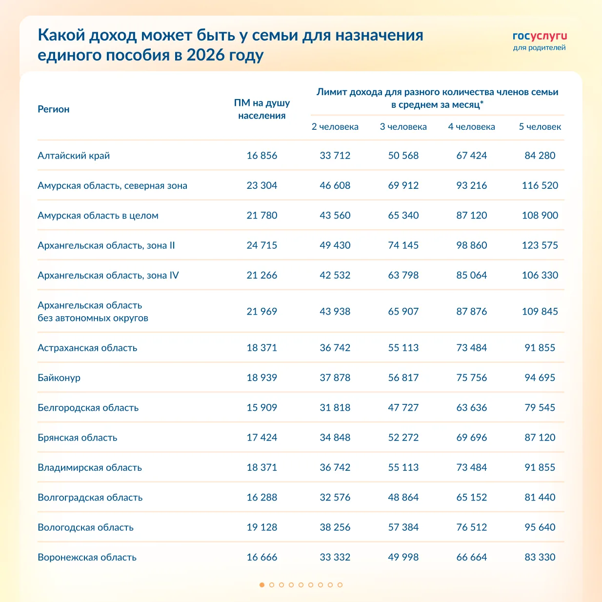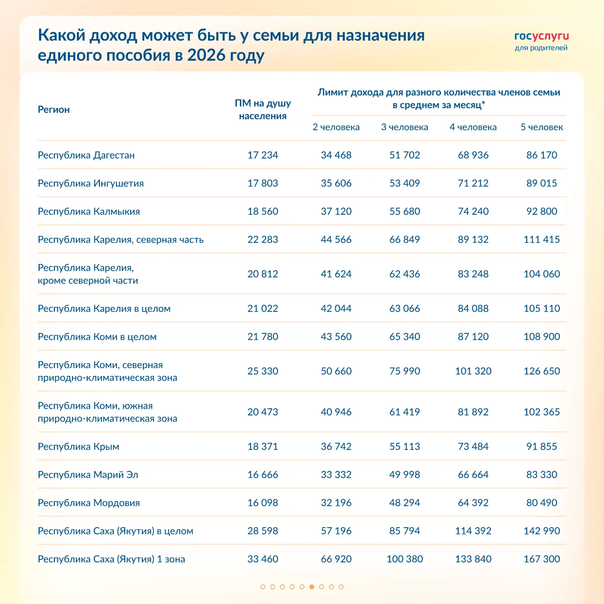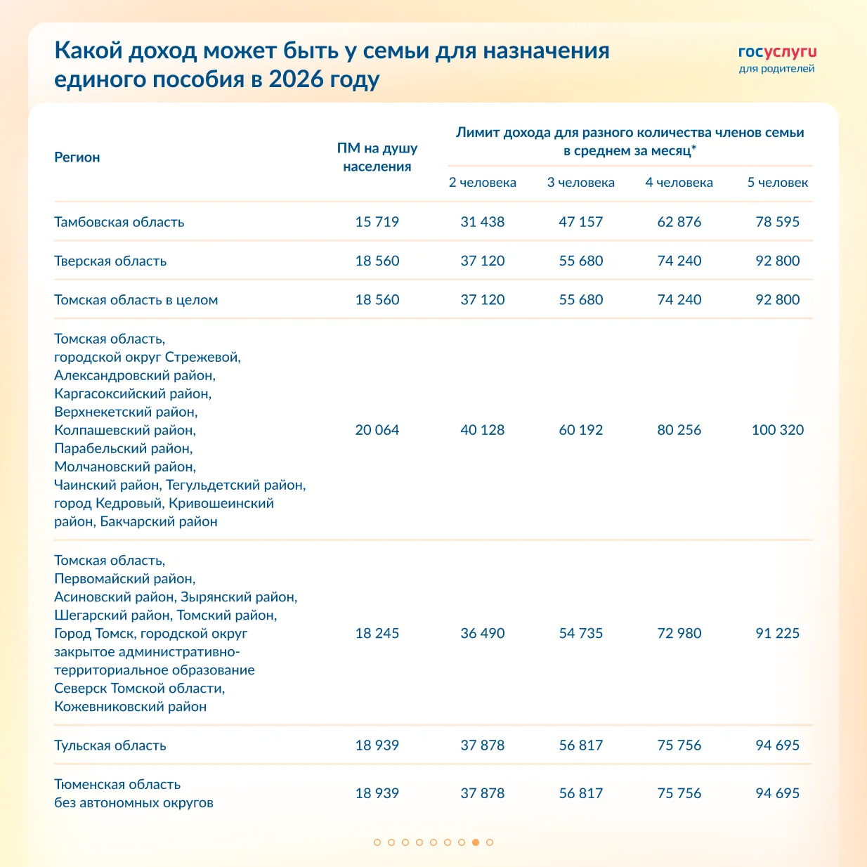 🔹 Для назначения единого пособия среднедушевой доход не должен превышать прожиточного минимума на душу населения в регионе. Проверьте, какой лимит для вашей семьи с учетом ее состава.