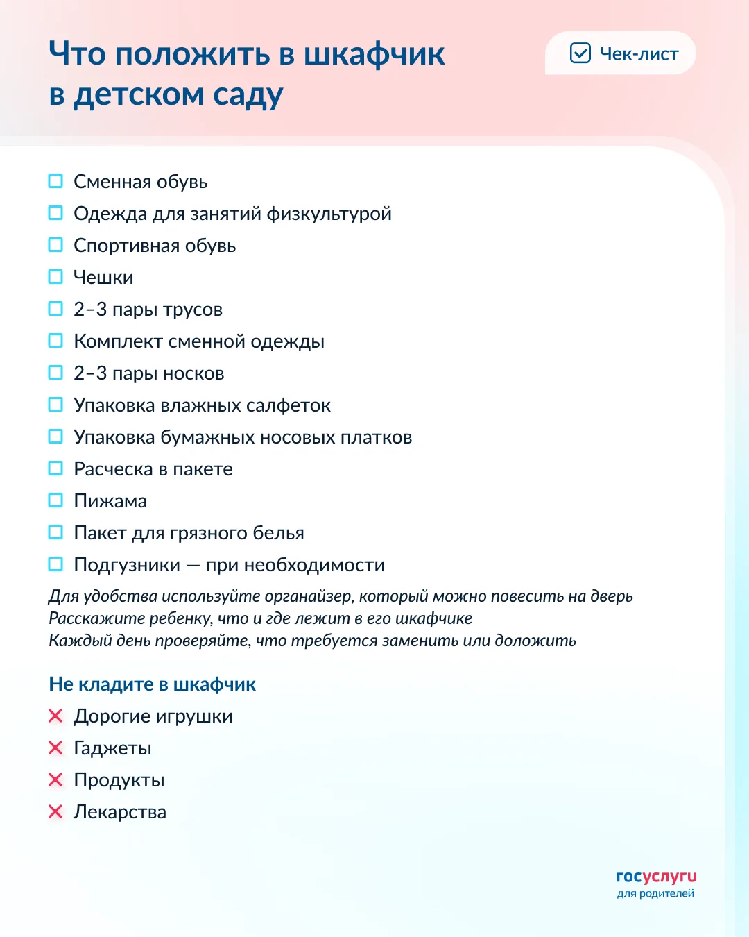 Чек-лист со списком вещей, которые стоит положить в шкафчик ребенка