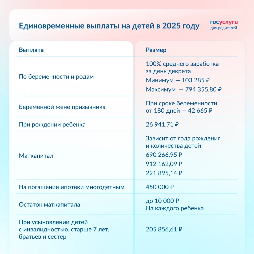 🔹 Пособие при рождении ребенка не зависит от дохода родителей и количества детей. На его размер влияет дата рождения.