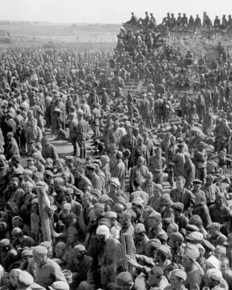 Оставшихся в живых погнали в созданный неподалеку лагерь для военнопленных. На территории бывшего кирпичного завода не было ничего, кроме навесов для сушки кирпича. В нормальных условиях на этой территории могло содержаться шесть-семь тысяч человек; на деле туда набили 74 тысячи.