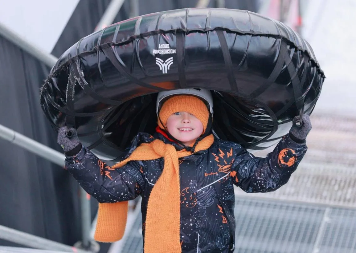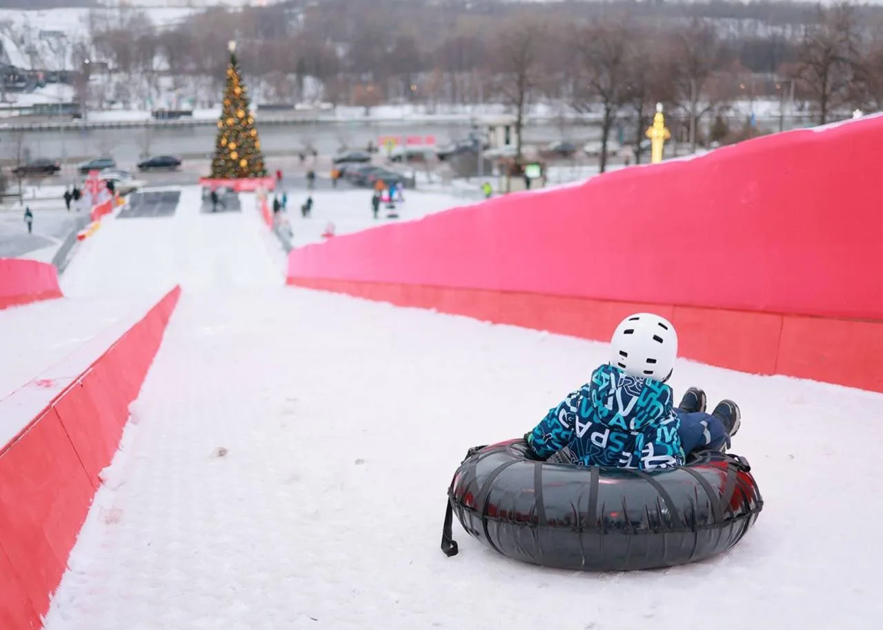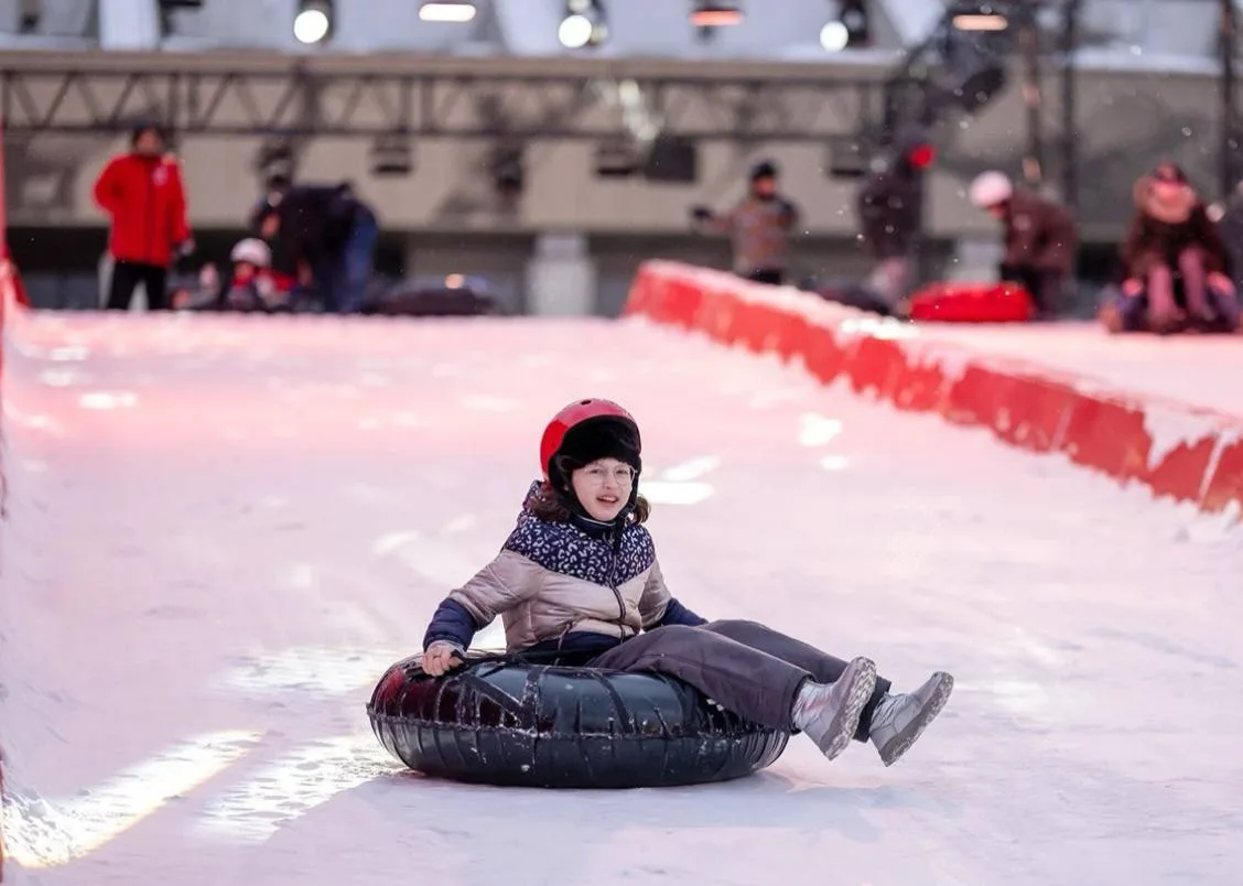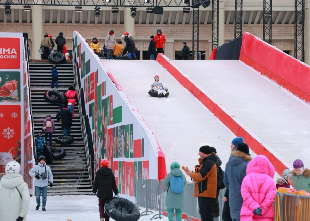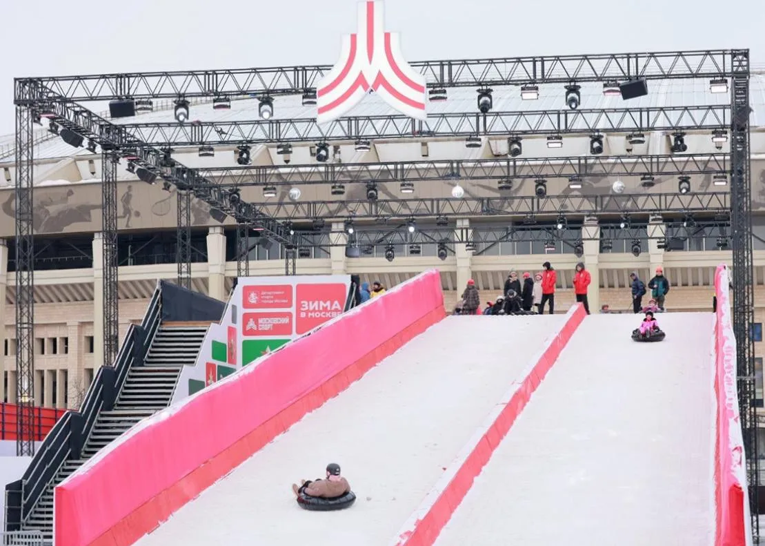 В Лужниках можно прокатиться с ветерком на горке для катания на тюбингах высотой три с половиной метра. Она находится на площади Ленина перед Большой спортивной ареной.