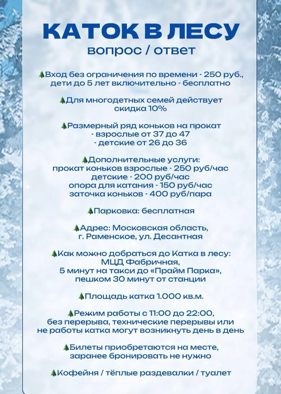Здесь есть теплая раздевалка, горячий чай, бесплатная парковка, прокат коньков и инвентаря для начинающих, а стоимость катания на весь день символическая.
