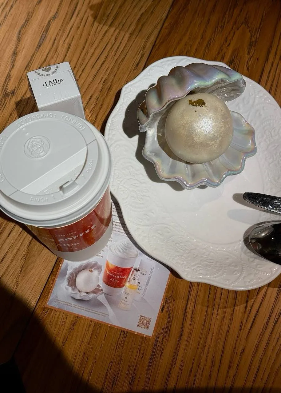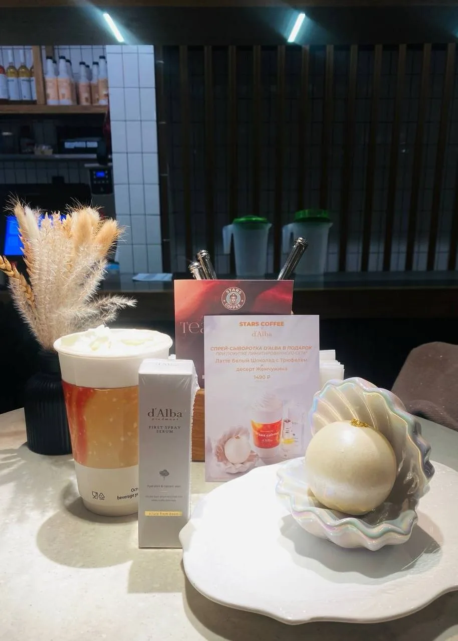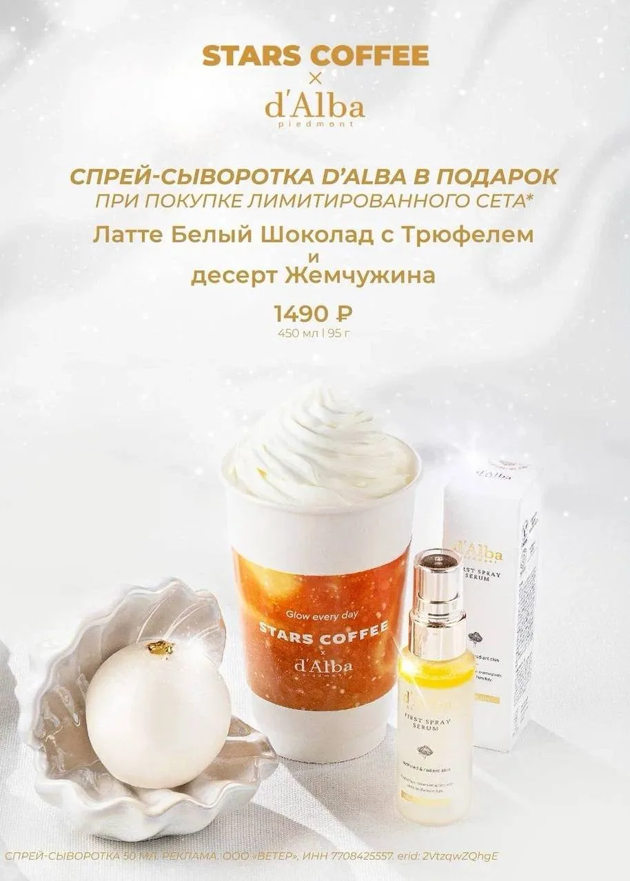 В кофейне Stars Selected при заказе лимитированного сета с эксклюзивным десертом Жемчужиной и латте Белый Шоколад с Трюфелем (1490 ₽) вам подарят бестселлер бренда d’Alba — спрей-сыворотку с белым трюфелем First Spray Serum (50 мл).