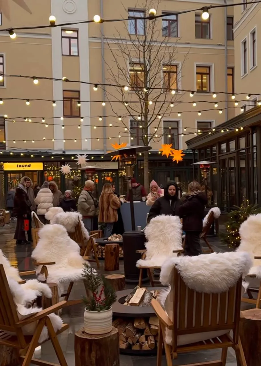 Во дворе исторического особняка открыта атмосферная зимняя лаундж-зона.