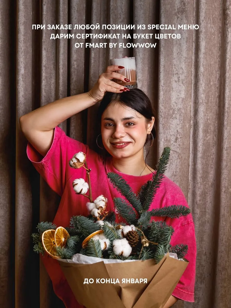 При заказе любой позиции из спешл-меню, вы получите сертификат на букет цветов от FMART by flowwow на сумму от 1000 ₽ до 5000 ₽. Сумма сертификата определяется случайно.