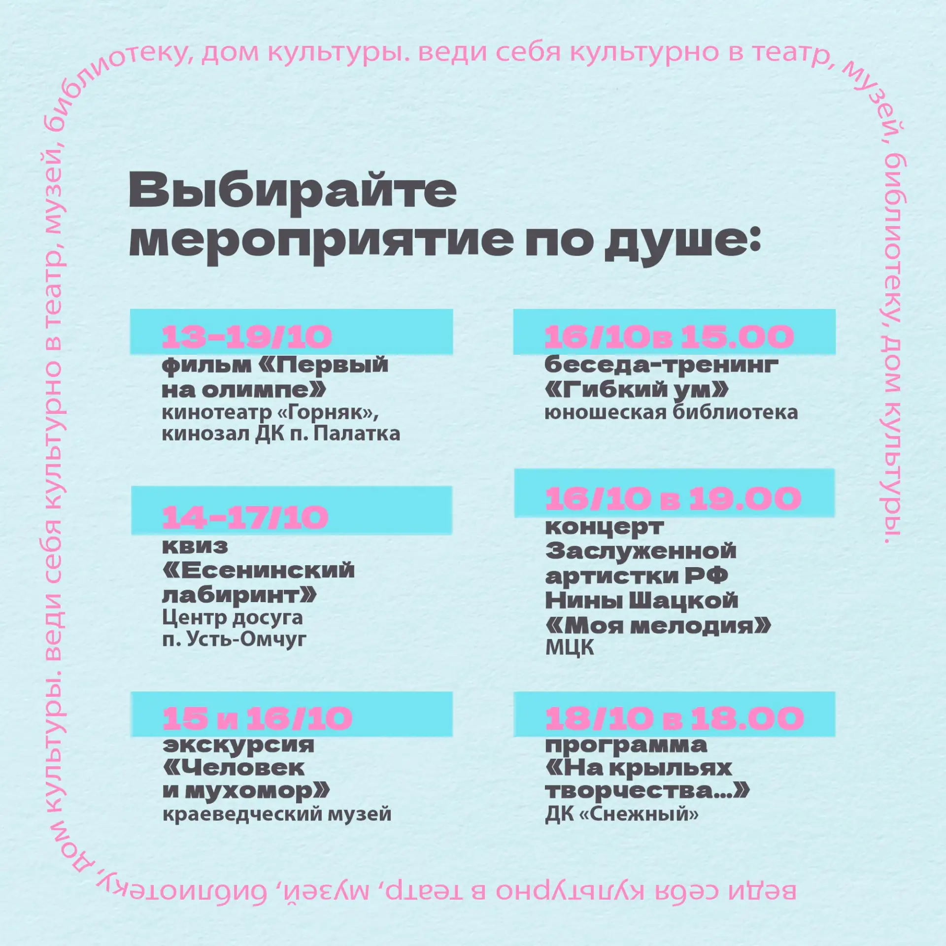 Минкульт Колымы представляет подборку интересных событий, которые можно посетить с Пушкинской картой на неделе с 13 по 19 октября