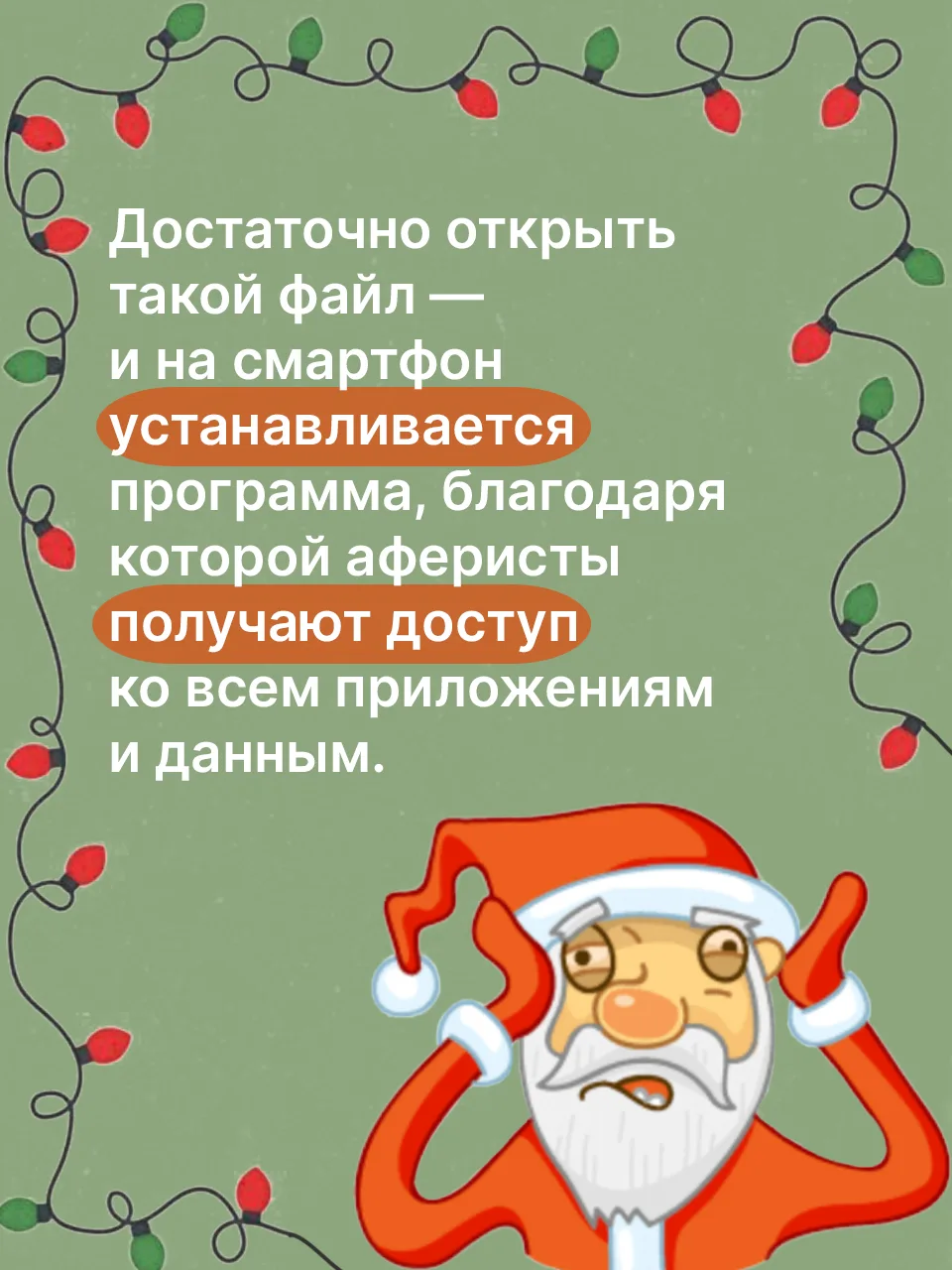 Аферисты усыпляют бдительность, рассылая безобидные, на первый взгляд, "новогодние открытки". В чём таится их опасность? И как защитить себя и своих близких от лишних проблем и рисков? Подробнее об этом - в наших карточках.