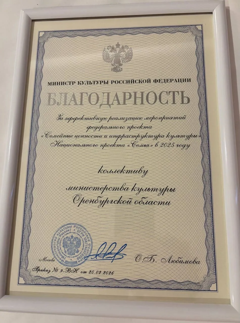 Министерство культуры Оренбургской области получило награду за достижение ключевых показателей в 2025 году