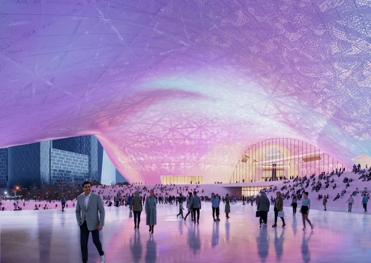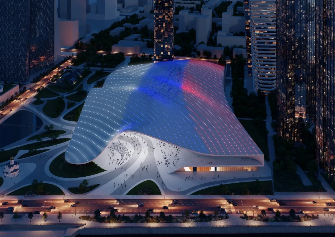 Архитекторы перенесли плавные линии покрова в облик здания. Легкость, динамичность, наполненность светом и воздухом, открытость людям и городу — вот те ощущения, которые стремились передать авторы.