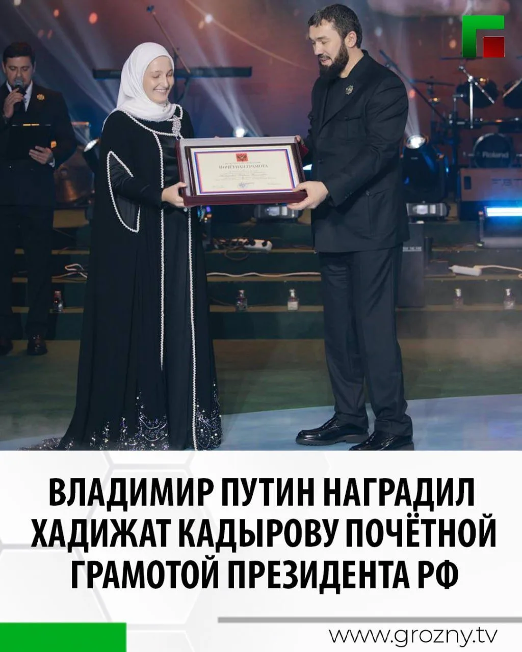 ⚡️Президент Российской Федерации Владимир Путин своим распоряжением наградил внучку Первого Президента Чеченской Республики, Героя России Ахмата-Хаджи Кадырова — Хадижат Почётной грамотой Президента РФ. Об этом Глава ЧР Рамзан Кадыров сообщил в своем телеграм-канале.