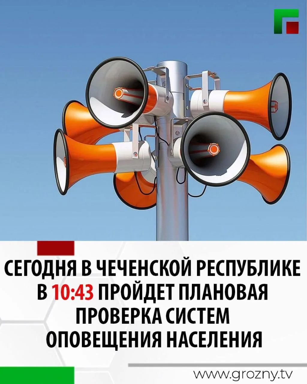 Сегодня, 1 октября, в 10:43 в Чеченской Республике пройдет плановая проверка систем оповещения населения. Эти системы предназначены для своевременного доведения сигнала до граждан в случае угрозы или возникновения чрезвычайных ситуаций природного и техногенного характера.