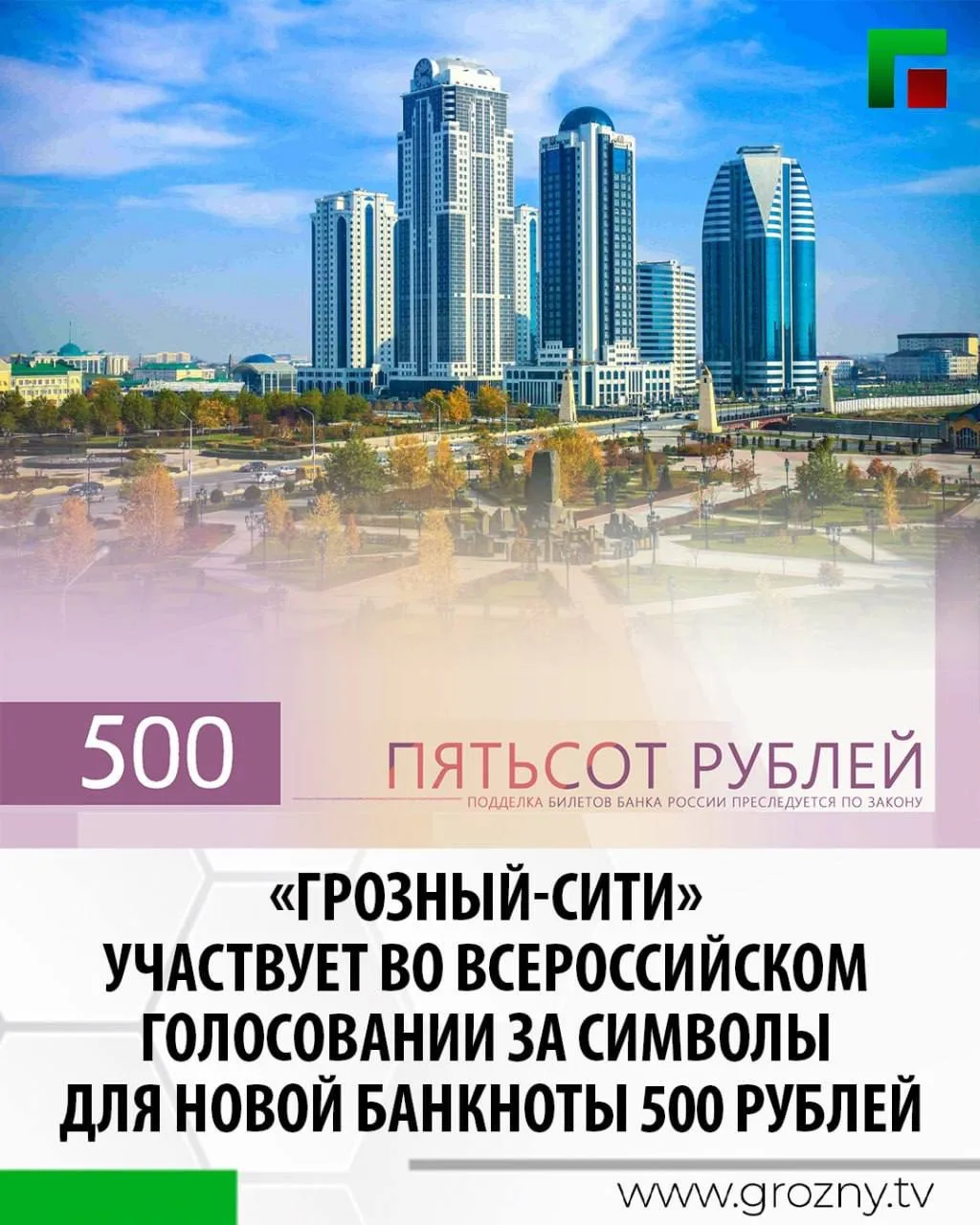 ⚡️Банк России запустил всероссийское онлайн-голосование за символы на новой 500-рублёвой купюре. Среди них — высотный комплекс «Грозный-Сити» — символ силы, красоты и возрождения Чеченской Республики. Комплекс участвует в выборе оборотной стороны банкноты.