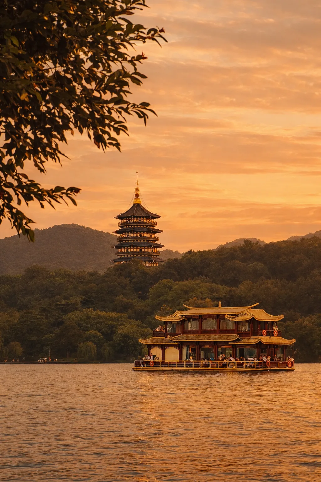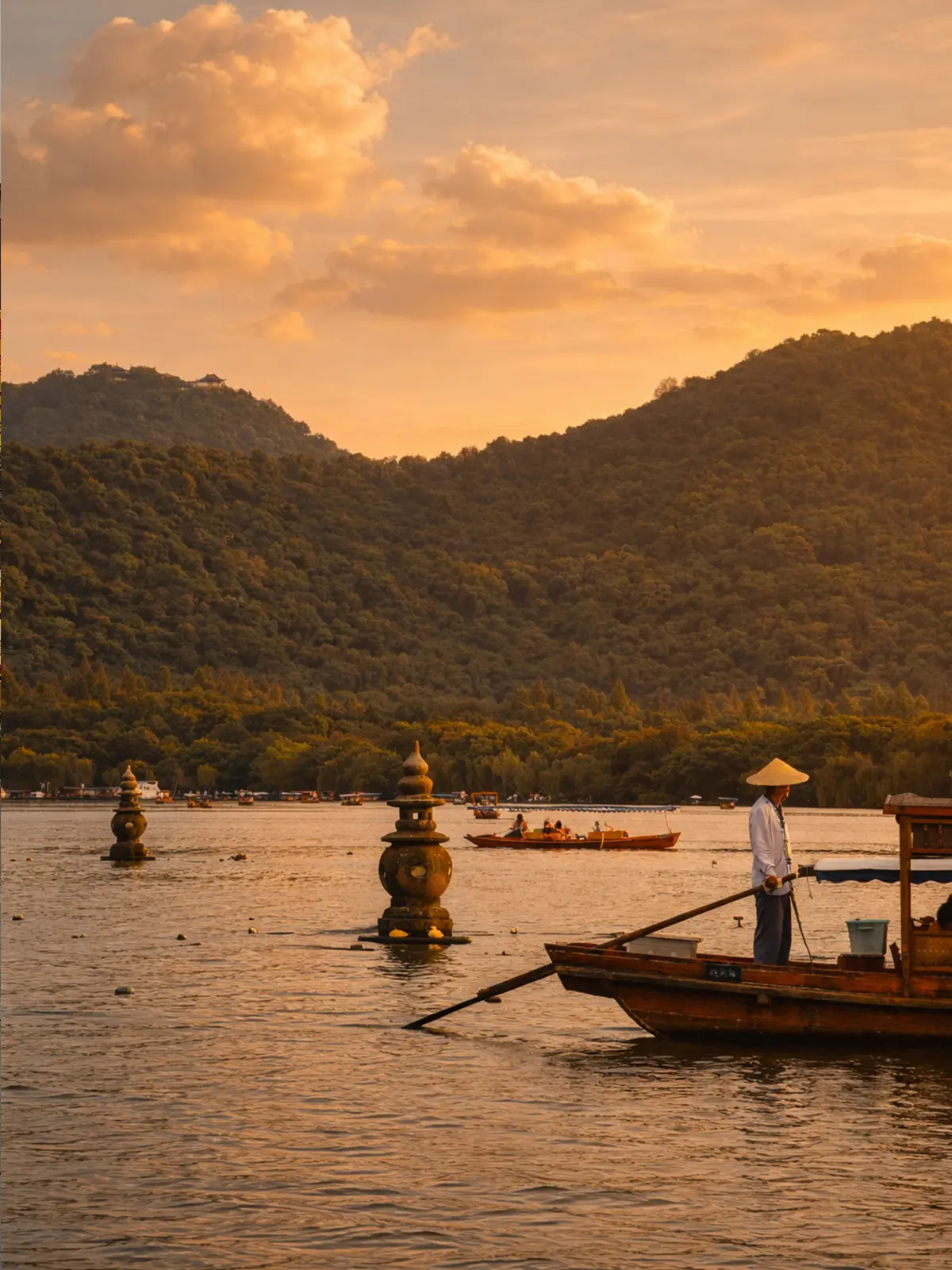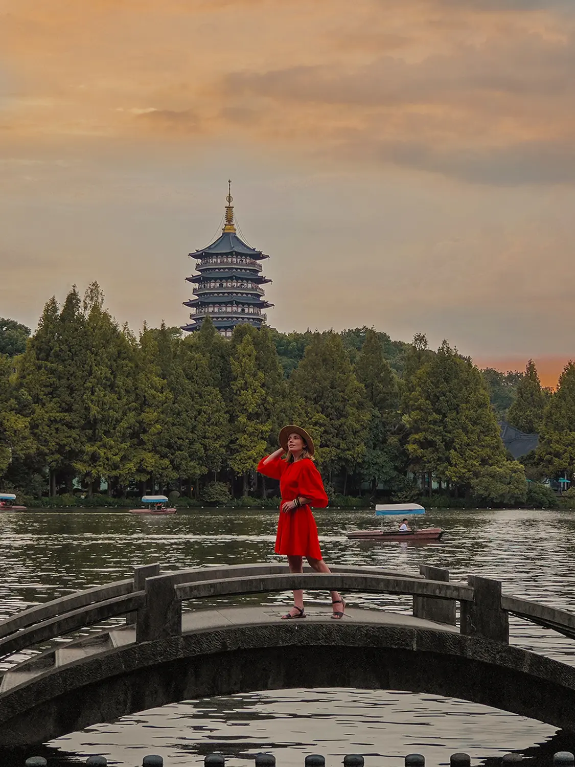 Пробыли там почти до заката. На лодке перебрались на противоположную сторону озера, там, где пагода Лэйфэн (ещё один символ города).