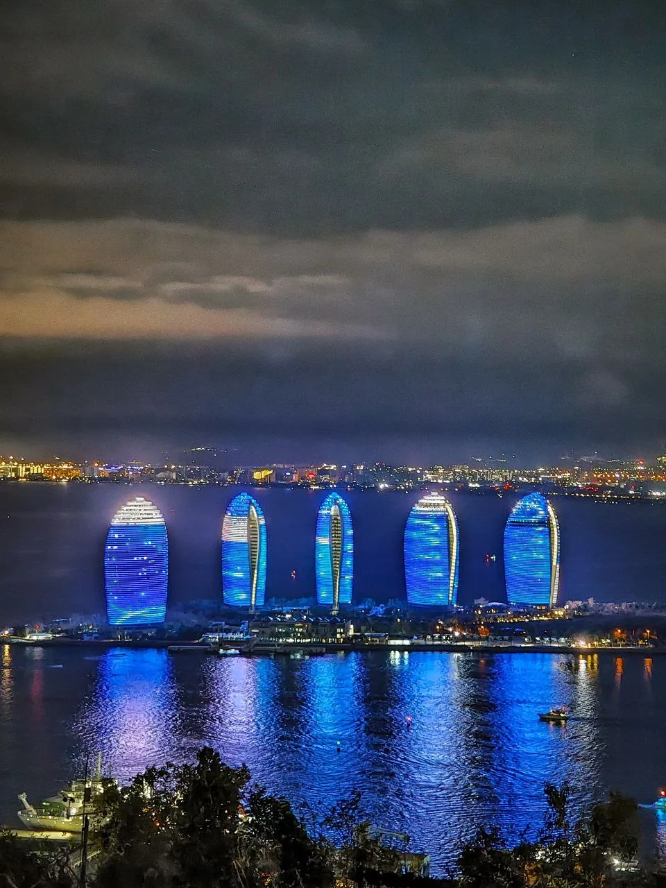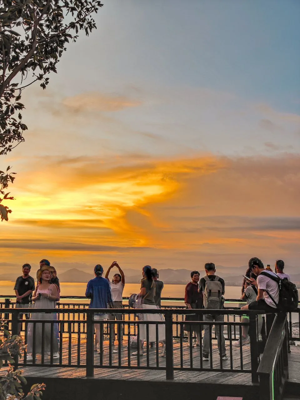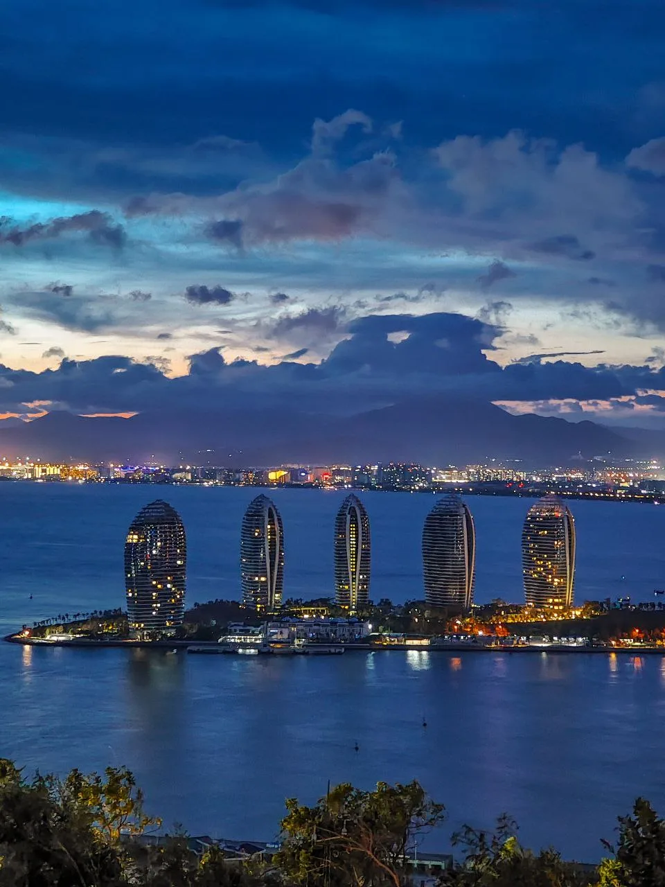 🏞️ Виды открываются – ну просто вау! Остров Феникс, высотки, Санья-бей как на ладони. Да и в самом парке очень красиво: дорожки, беседки, лавочки, красиво всё подсвечивается. Можно взять напиток и перекус и позалипать с вкусняшками на виды. Или даже поужинать в одной из кафешек.