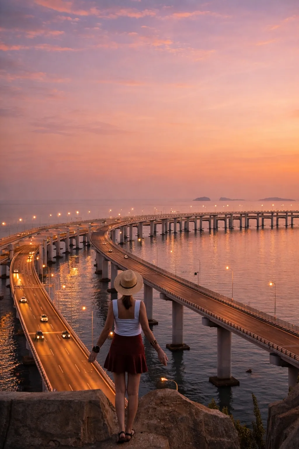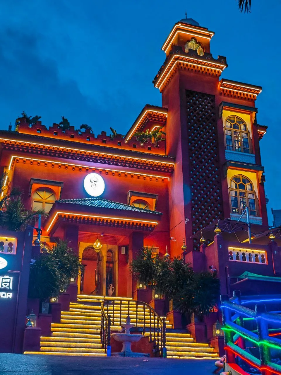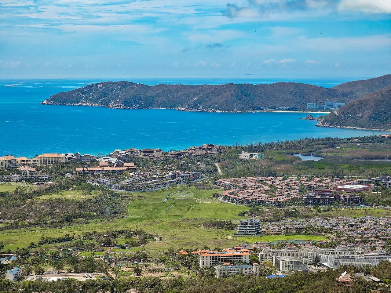 🏞️ Виды открываются – ну просто вау! Остров Феникс, высотки, Санья-бей как на ладони. Да и в самом парке очень красиво: дорожки, беседки, лавочки, красиво всё подсвечивается. Можно взять напиток и перекус и позалипать с вкусняшками на виды. Или даже поужинать в одной из кафешек.