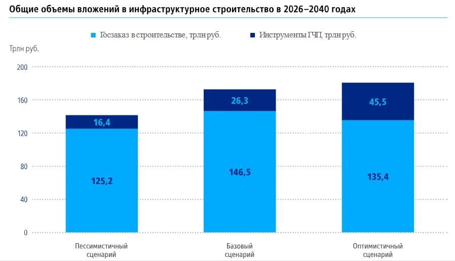- В ближайшие 15 лет применение инструментов ГЧП при создании или реконструкции инфраструктурных объектов привлечёт 29 трлн рублей инвестиций. При этом возможны три основных сценария развития инфраструктуры (см. инфографику).