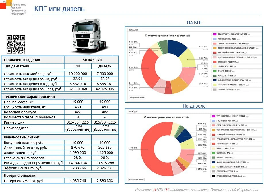 При покупке тягач на газе дороже на 3,1 млн рублей. Но в эксплуатации тягач на КПГ дешевле на 2 млн рублей в год.