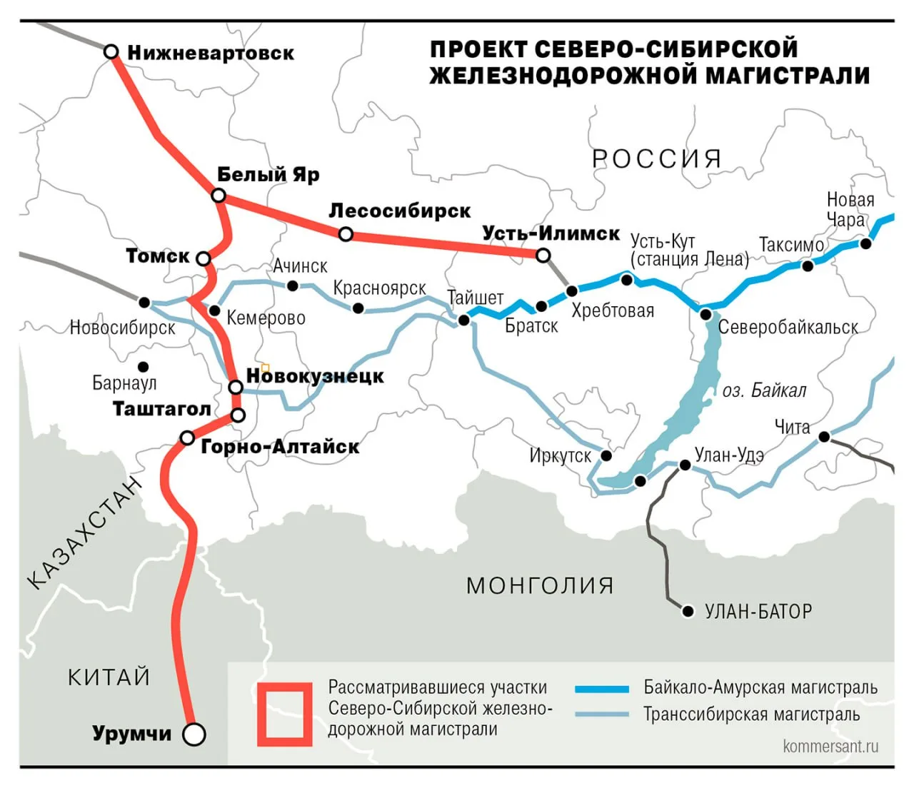 Идее строительства такой дороги много лет. Проект участка Нижневартовск - Белый Яр - Усть-Илимск (порядка 1,9 тыс. км) упоминался в стратегиях развития ж/д транспорта и Дальнего Востока конца нулевых. Рассмотреть вопрос её строительства президент поручил два года назад.