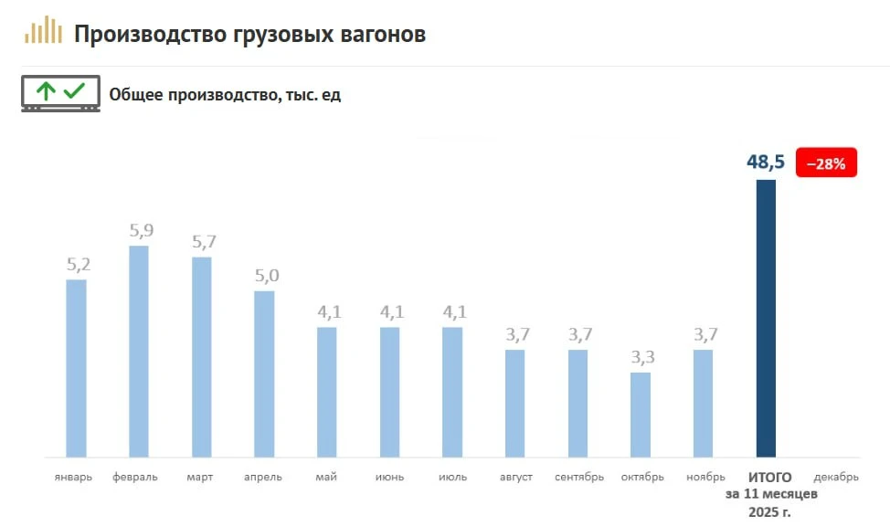 По данным Объединения вагоностроителей, за 11 месяцев производство грузовых вагонов снизилось на 28%, до 48,5 тыс. единиц.