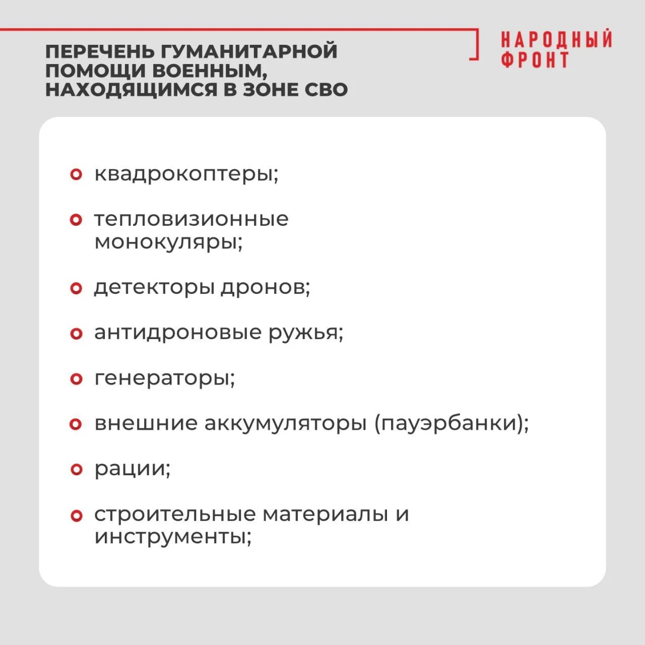 Регулярно Народный фронт в Нижегородской области спрашивают, чем можно помочь бойцам спецоперации. Мы подготовили список необходимых вещей для наших бойцов.