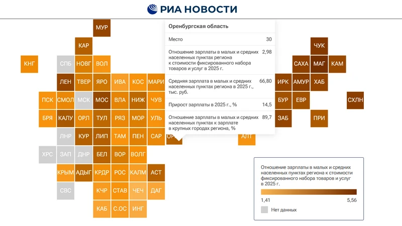 По данным рейтинга РИА Новости, по итогам 2025 года Оренбургская область заняла 30 место среди регионов России по уровню зарплат в малых и средних населённых пунктах. Средняя зарплата в регионе после вычета НДФЛ составила около 67 000 рублей. Этой суммы хватает для приобретения почти трех фиксированных наборов товаров и услуг. За год доходы жителей Оренбургской области выросли на 14,5%.