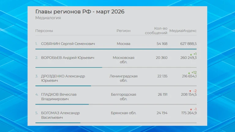 По итогам первого весеннего месяца 2026 года Александр Богомаз опустился с четвертой на пятую строчку. Медиаиндекс брянского руководителя составил 175 264,9 (128 691,8 в прошлом месяце). Его имя упоминали в информационных сообщениях в теле- и радиоэфире, в печатных и электронных СМИ 24 194 раз (18 659 в феврале).