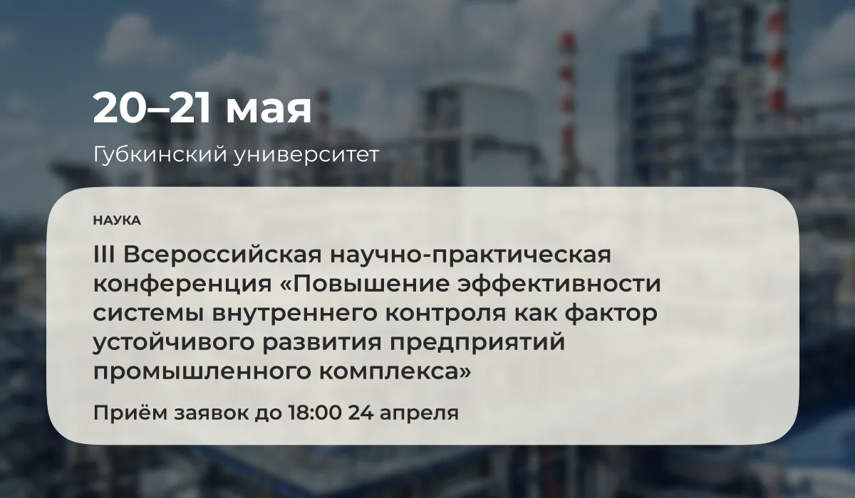 🏭 С 20 по 21 мая 2026 года в РГУ нефти и газа (НИУ) имени И.М. Губкина пройдёт III Всероссийская научно-практическая конференция «Повышение эффективности системы внутреннего контроля как фактор устойчивого развития предприятий промышленного комплекса».